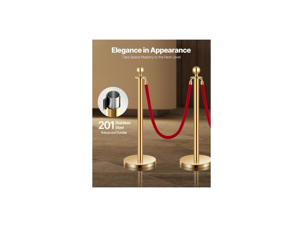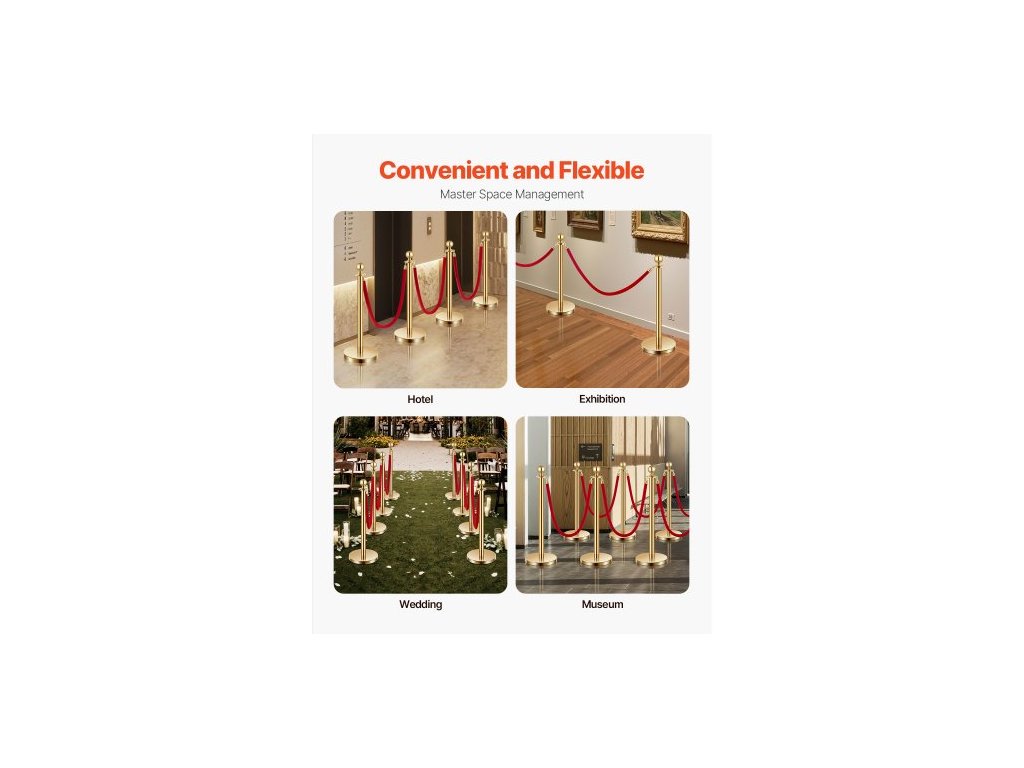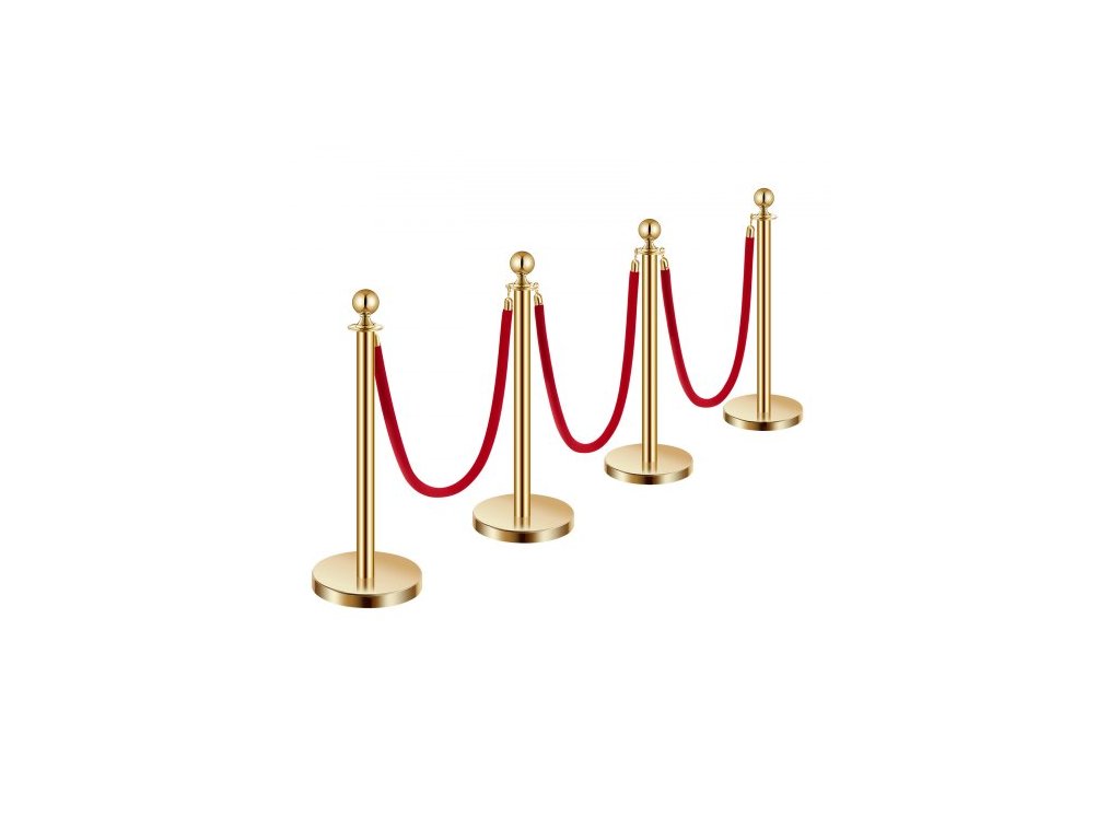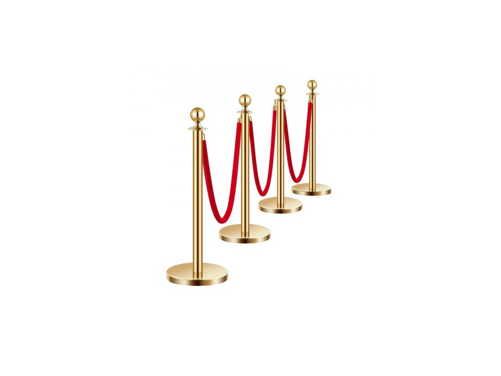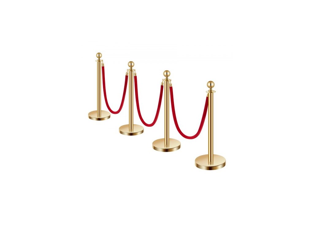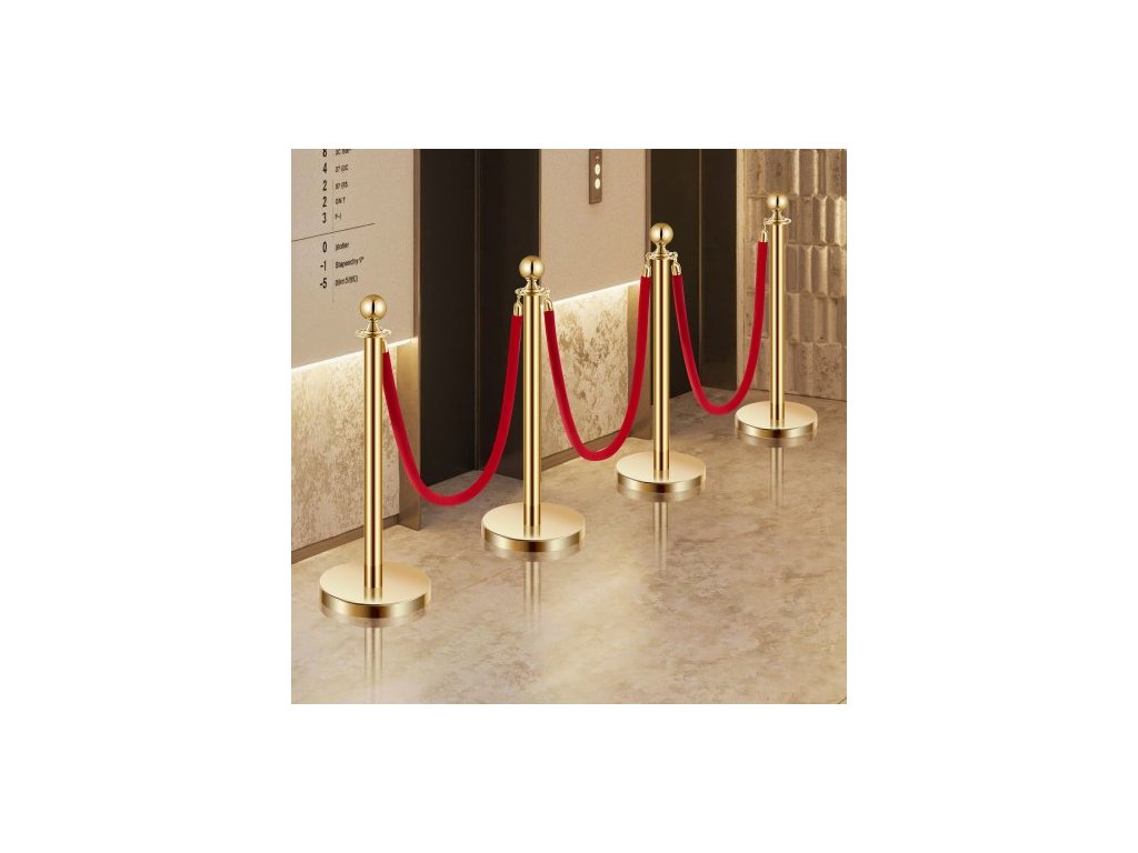 Sloupky, sada 4 ks pro regulaci davu se 3 červenými sametovými lany, fronta z nerezové oceli o délce 5 stop (1,5 m) se zlatými sloupky s dutou základnou pro vstřikování písku, pro divadlo, večírek, svatbu, výstavu