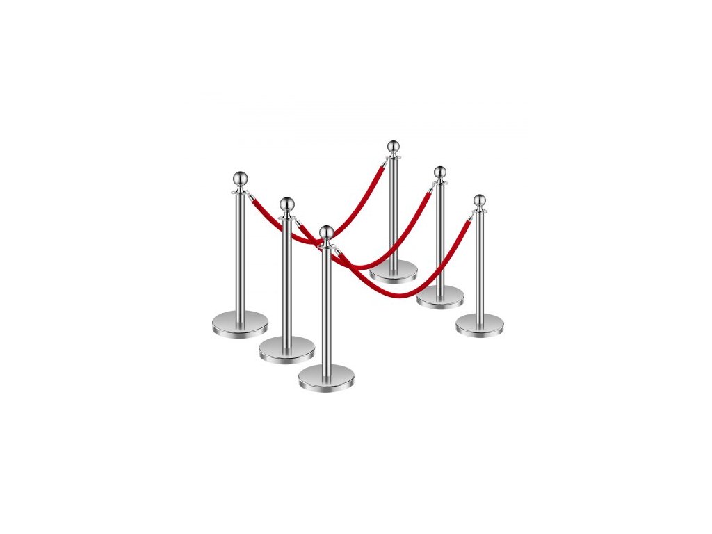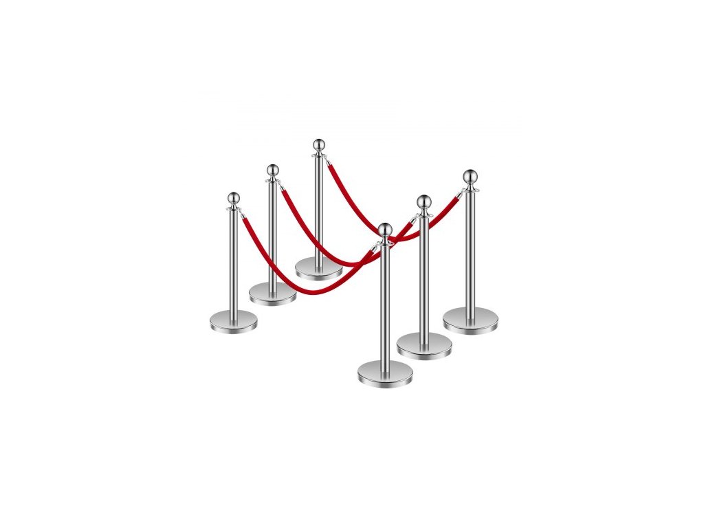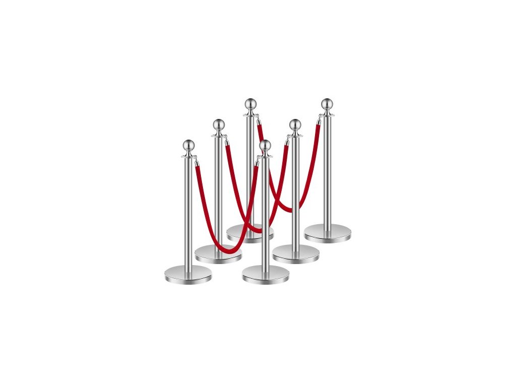 Sloupky, sada 6 ks pro regulaci davu se 3 červenými sametovými lany, fronta z nerezové oceli o délce 5 stop (1,5 m) se stříbrnou základnou z vstřikovaného písku pro divadlo, večírek, svatbu, výstavu