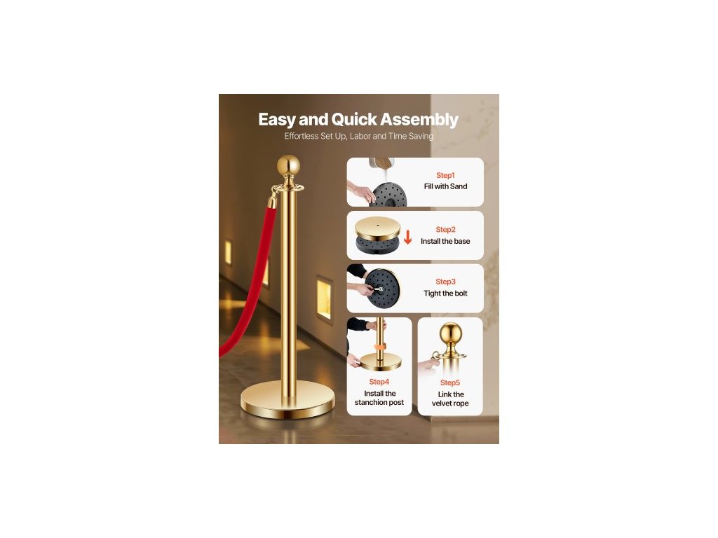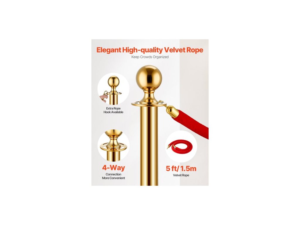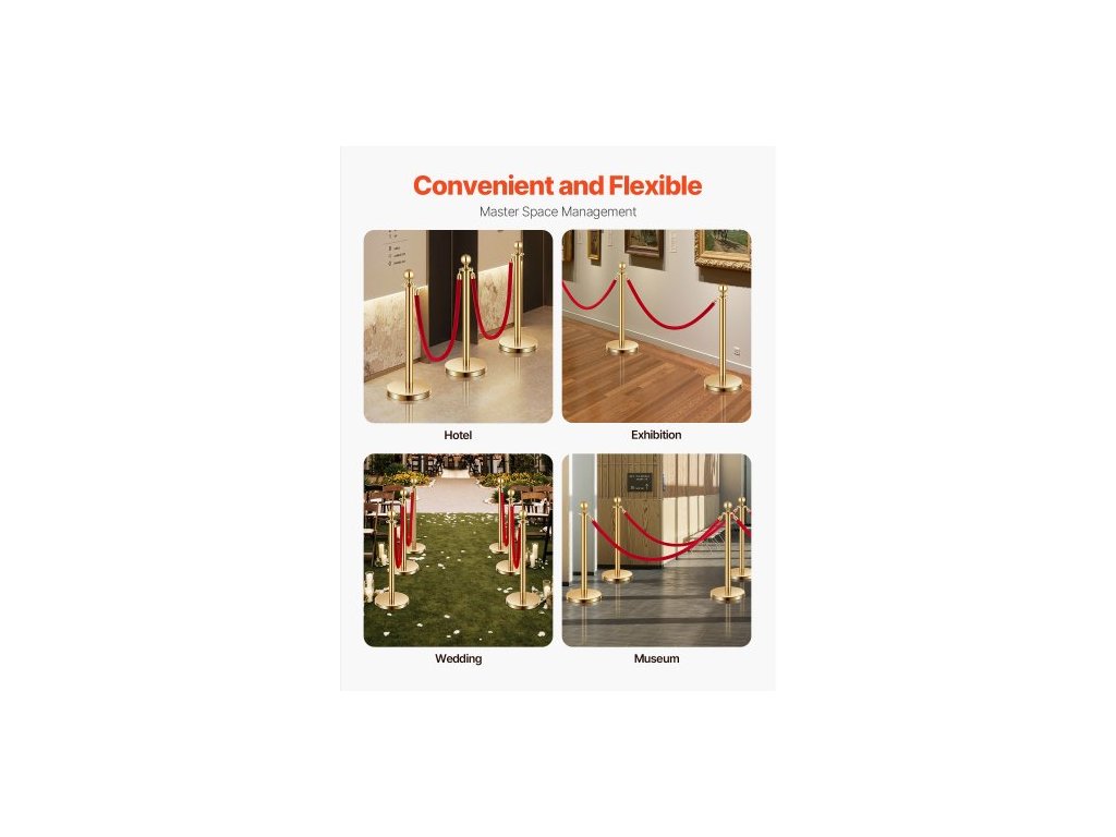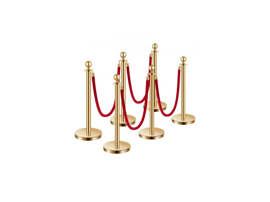 Sloupky a sametové lana 6 ks, dutá základna s nerezovým sloupkem, 4 červená sametová lana a sloupky, bariéry pro kontrolu davu, zlaté sloupky, tyče na běhoun s červeným kobercem pro párty potřebyElegantní a odolné