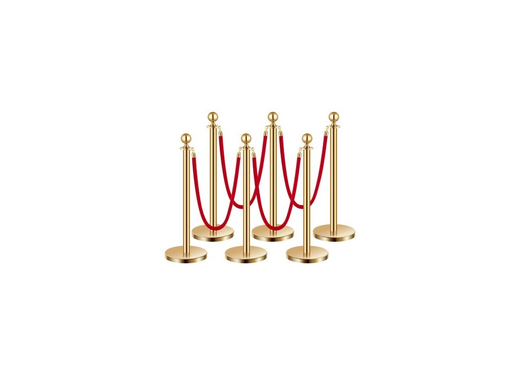 Sloupky a sametové lana 6 ks, dutá základna s nerezovým sloupkem, 4 červená sametová lana a sloupky, bariéry proti davu, zlaté sloupky, tyče na běhoun z červeného koberce, párty potřeby