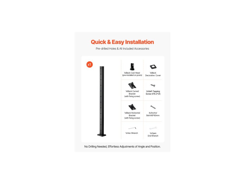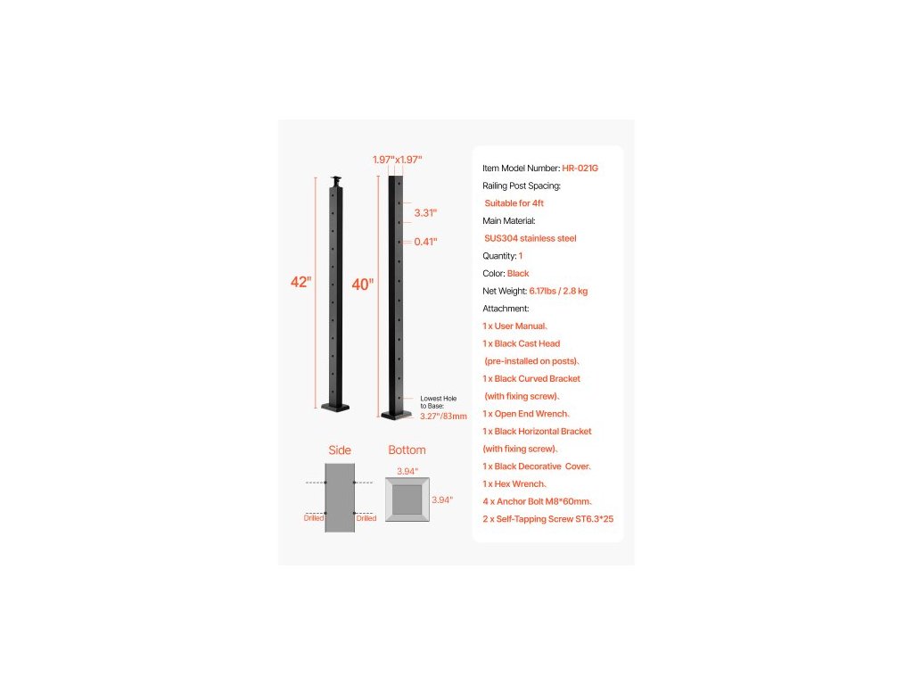 Tloušťka: 0,06"/1,5 mm,Způsoby spojení: Beton/Dřevo,Rozměry položky: 42 x 1,97 x 1,97"/106,7 x 5 x 5 cm,Rozměry základny: 5 x 3,46 x 0,61"/127 x 88 x 15,5 mm,Vzdálenost otvorů: 3,15"/80 mm,Barva: Černá, Číslo modelu položky: HR-021G, Materiál: Nerezová ocel + práškový nástřik, Průměr otvoru: 105 mm, Hmotnost položky: 2,5 kg