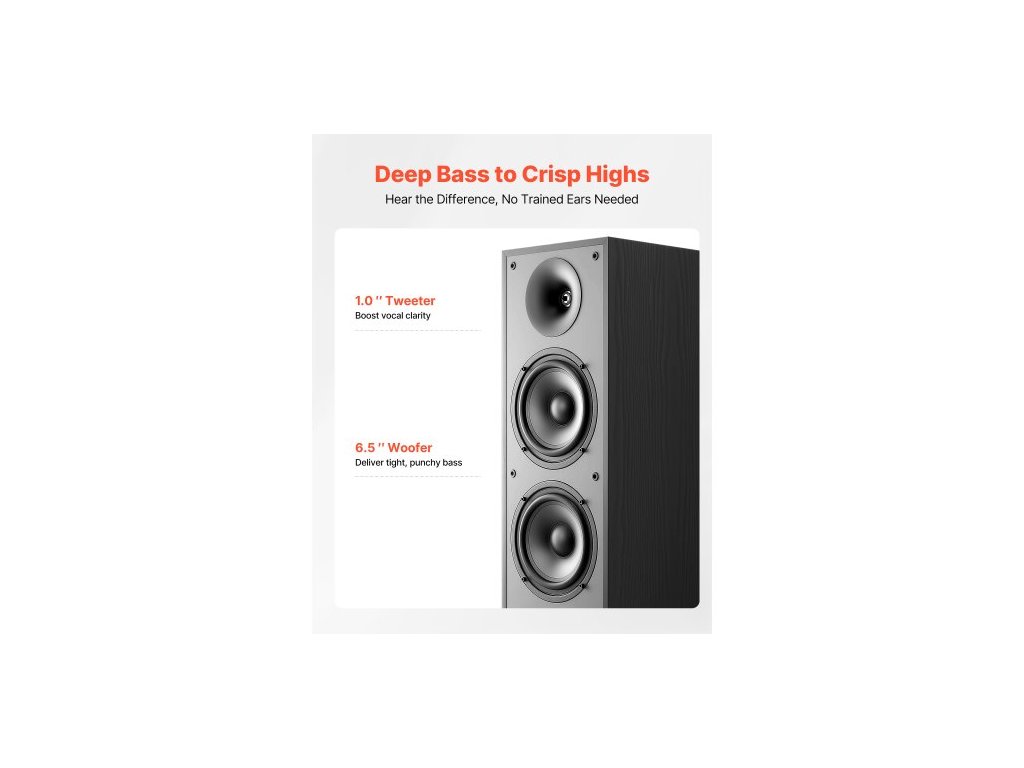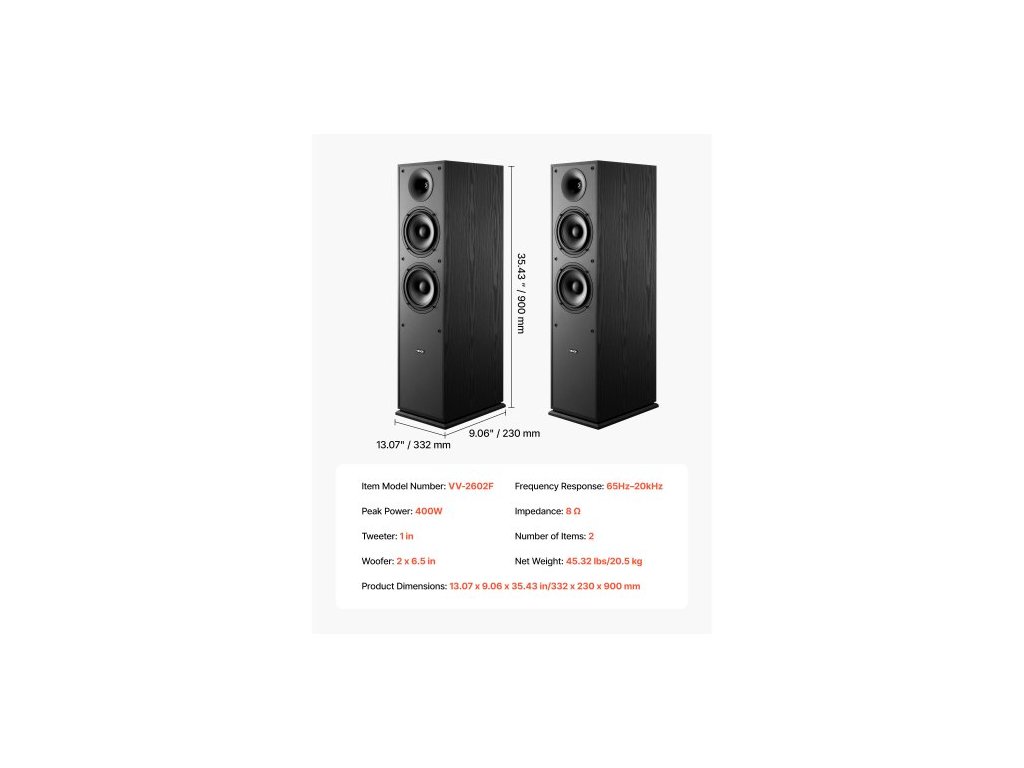 Špičkový výkon: 400 W, Výškový reproduktor: 1 palec, Číslo modelu položky: VV-2602F, Basový reproduktor: 2 x 6,5 palce, Frekvenční odezva: 65 Hz–20 kHz, Impedance: 8 Ω, Počet položek: 2