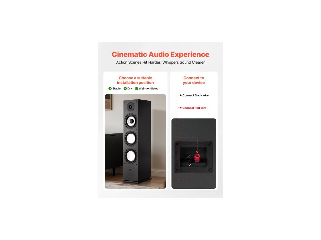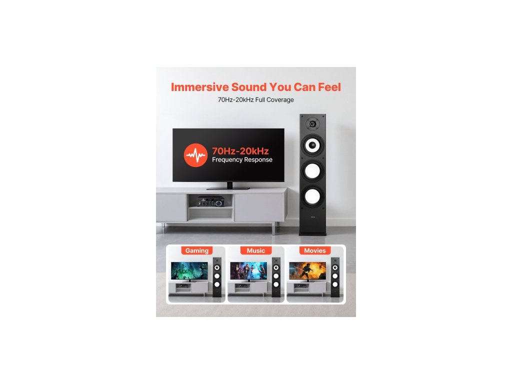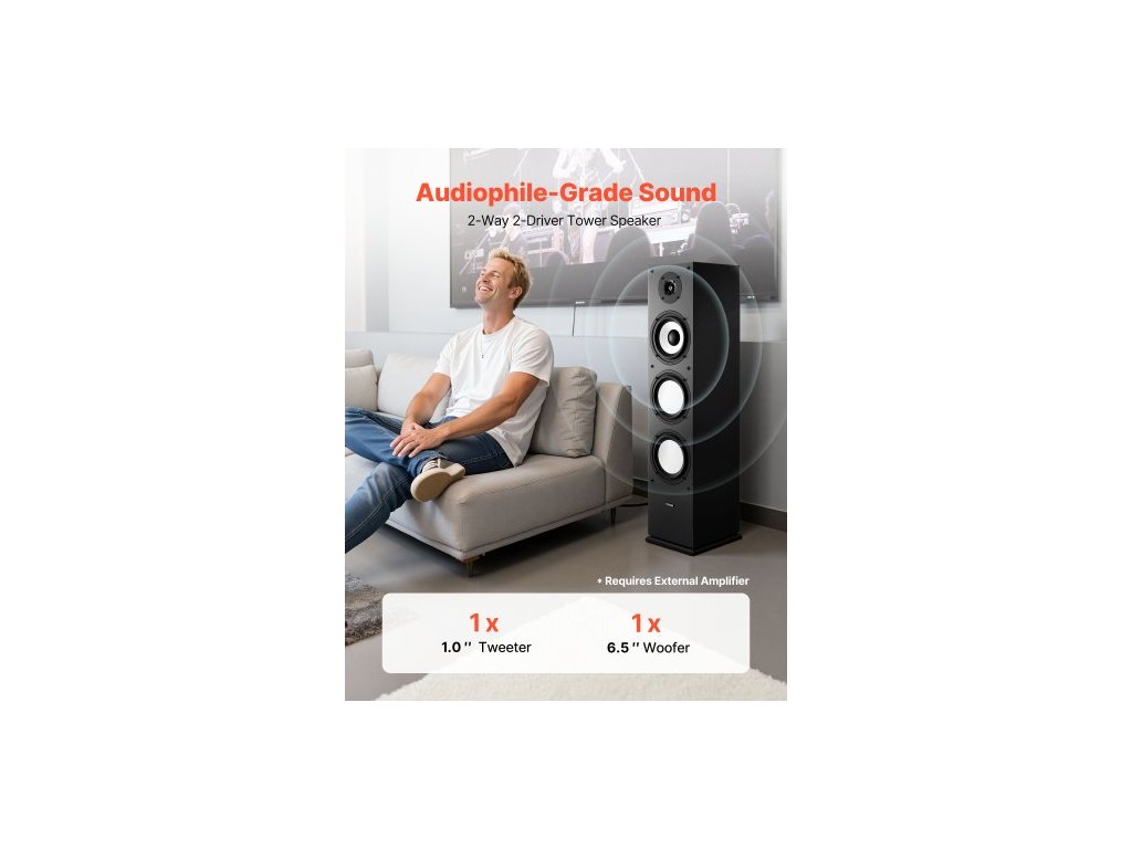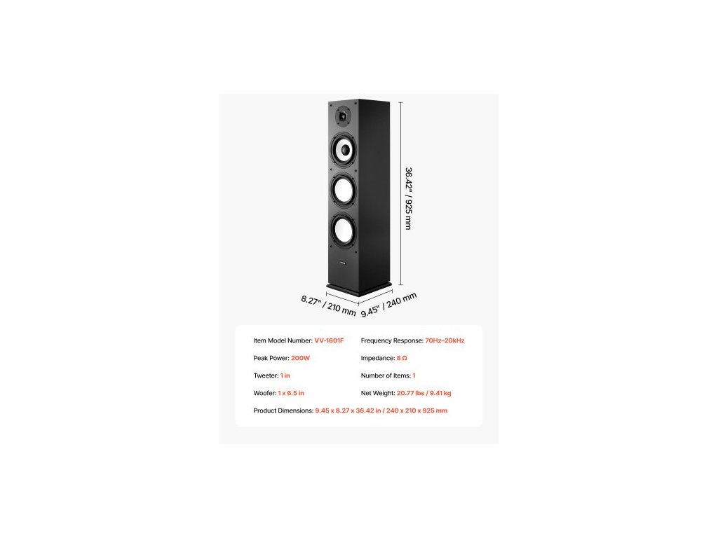 Sloupový reproduktor , 2pásmový, sloupový reproduktor s 25,4mm výškovým reproduktorem, 165,1mm basovým reproduktorem, špičkový výkon 200 W, frekvenční odezva 70Hz–20kHz, odolná MDF skříň, pro domácí audio, jeden 1palcový výškový reproduktor, 6,5palcový basový reproduktor, MDF skříň, vynikající kvalita zvuku, vylepšená stabilita, snadná instalace, špičkový výkon: 200 W, výškový reproduktor: 1 palec, číslo modelu: VV-1601F, basový reproduktor: 6,5 palce, frekvenční odezva: 70Hz–20kHz, impedance: 8 Ω, počet kusů: 1Doplňkové parametry