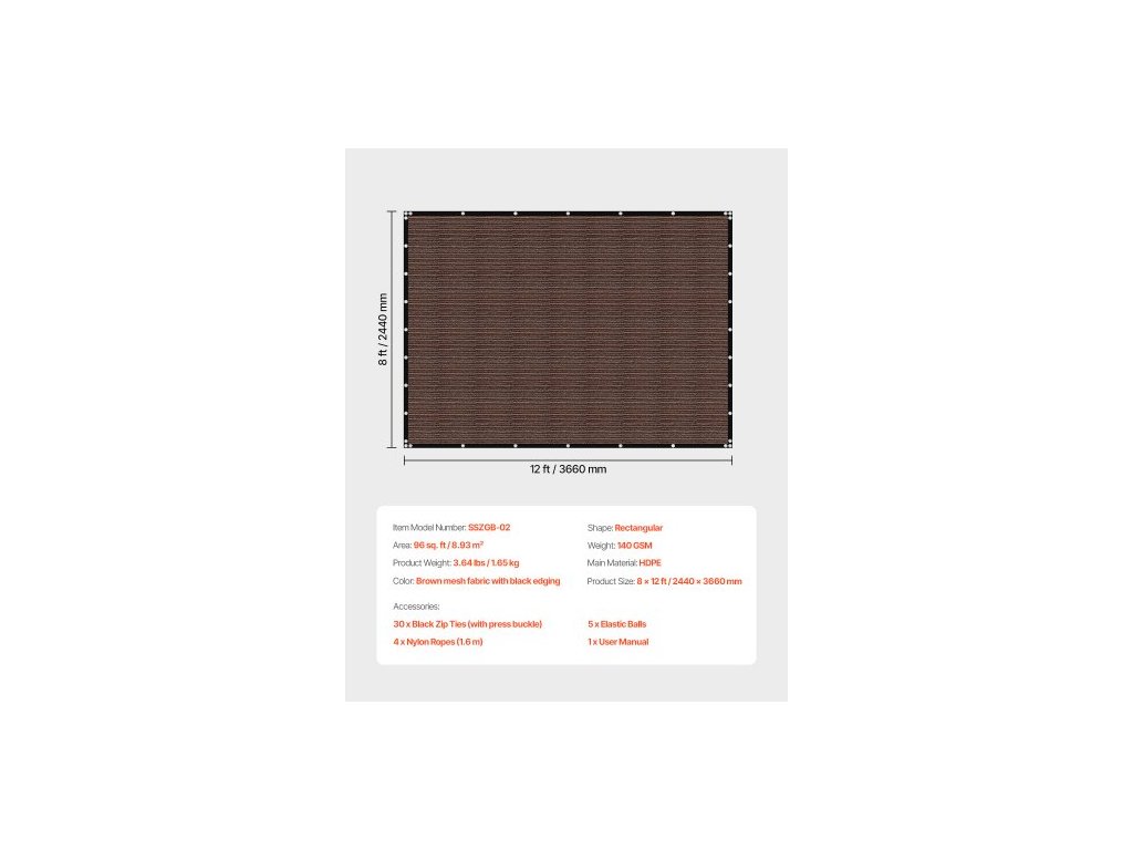 Plocha: 96 čtverečních stop / 8,93 m²,Tvar: Obdélníkový,Barva: Hnědá síťovina s černým lemováním,Číslo modelu položky: SSZGB-02,Hmotnost výrobku: 3,64 lbs / 1,65 kg,Hmotnost: 140 g/m²,Hlavní materiál: HDPE,Rozměry výrobku: 8 x 12 stop / 2440 x 3660 mm