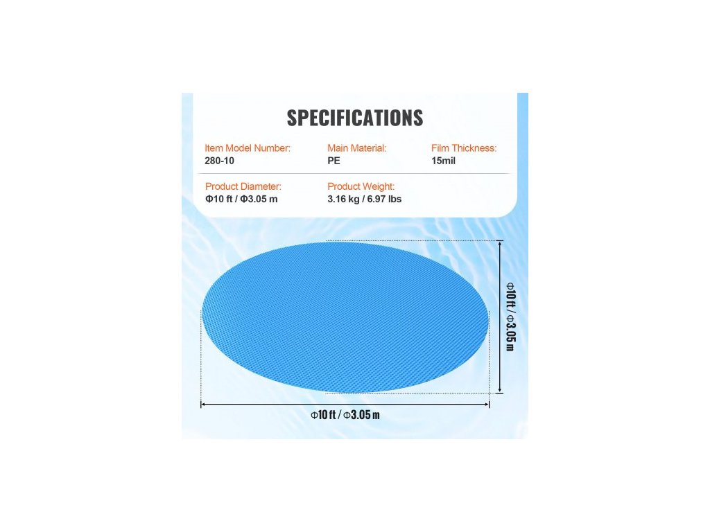 Průměr výrobku: Φ10 stop/Φ3,05 m,Číslo modelu položky: 280-10,Hmotnost výrobku: 3,16 kg/6,97 liber,Hlavní materiál: PE,Tloušťka fólie: 15 mil