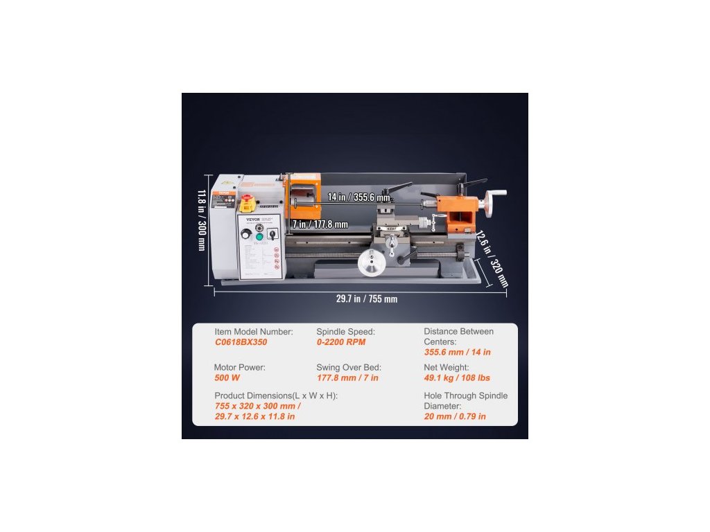 Otáčky vřetena: 0-2200 ot./min, Kužel koníku: MK2, Průměr vřetena skrz otvor: 20 mm / 0,79 palce, Číslo modelu položky: C0618BX350, Výkon motoru: 500 W, Průměr sklíčidla: φ100 mm / 3,9 palce, Kužel vřetena: MK3, Rozměry výrobku (D x Š x V): 755 x 320 x 300 mm / 29,7 x 12,6 x 11,8 palce, Čistá hmotnost: 49,1 kg / 108 liber, Hlavní materiál: Litina HT200