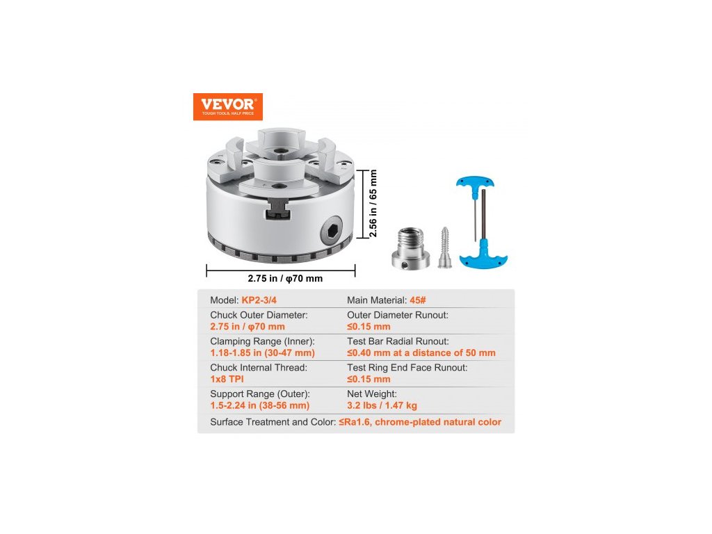 Rozsah upínání (vnitřní): 1,18-1,85 palce (30-47 mm),Házení vnějšího průměru: ≤0,15 mm, Radiální házení zkušební tyče: ≤0,40 mm ve vzdálenosti 50 mm, Povrchová úprava a barva: ≤Ra1,6, chromovaná přírodní barva,Házení čelní plochy zkušebního kroužku: ≤0,15 mm, Model: KP2-3/4, Rozsah uchycení (vnější): 1,5-2,24 palce (38–56 mm), vnitřní závit sklíčidla: 1*8 TPI, rozměry výrobku: φ70 x 65 mm, vnější průměr sklíčidla: 2,75 palce / φ70 mm, hmotnost netto: 3,2 libry / 1,47 kg, hlavní materiál: 45#