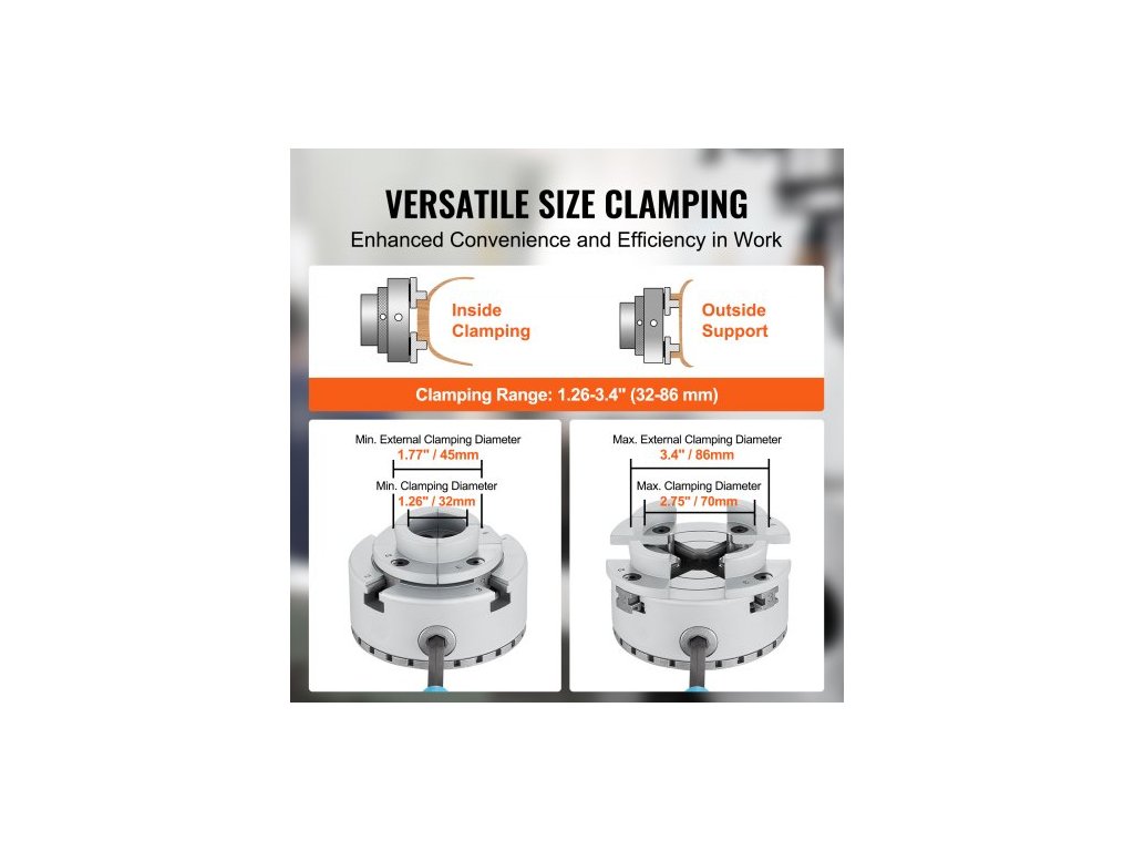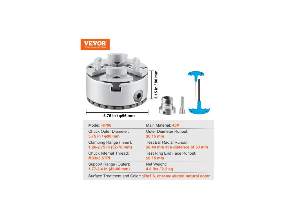 Rozsah upínání (vnitřní): 1,26-2,75"" (32-70 mm),Házení vnějšího průměru: ≤0,15 mm, Radiální házení zkušební tyče: ≤0,40 mm ve vzdálenosti 50 mm, Povrchová úprava a barva: ≤Ra1,6, chromovaná přírodní barva,Házení čelní plochy zkušebního kroužku: ≤0,15 mm, Číslo modelu položky: KP96, Rozsah uchycení (vnější): 1,77-3,4"" (45-86 mm), vnitřní závit sklíčidla: M33*3,5TPI, rozměry výrobku: φ96 x 80 mm, vnější průměr sklíčidla: 3,75"" / φ96 mm, hmotnost netto: 4,8 lb / 2,2 kg, hlavní materiál: 45#