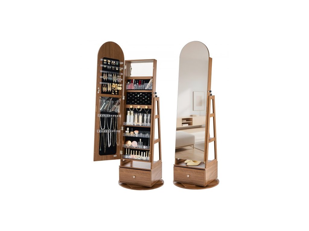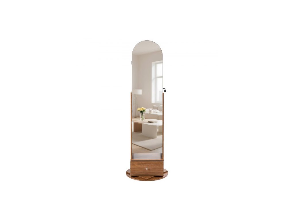 Šperkovnice otočná o 360°, výška 1655 mm, zrcadlo v celé délce s úložným prostorem, otočný organizér na šperkovnici, uzamykatelný 2 klíči, kapsičky na příslušenství, úložné police a zásuvkaOtvory na náušnice a náušnice