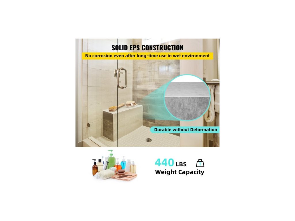 Sprchové sedátko s dlaždicemi, 96,5 cm x 28,4 cm x 51 cm, připravené k obložení dlažbou, vodotěsné z výroby a 100% nepropustné, obkladatelné rohové sprchové sedátko, nosnost 200 kg, obdélníková sprchová lavice s prknem