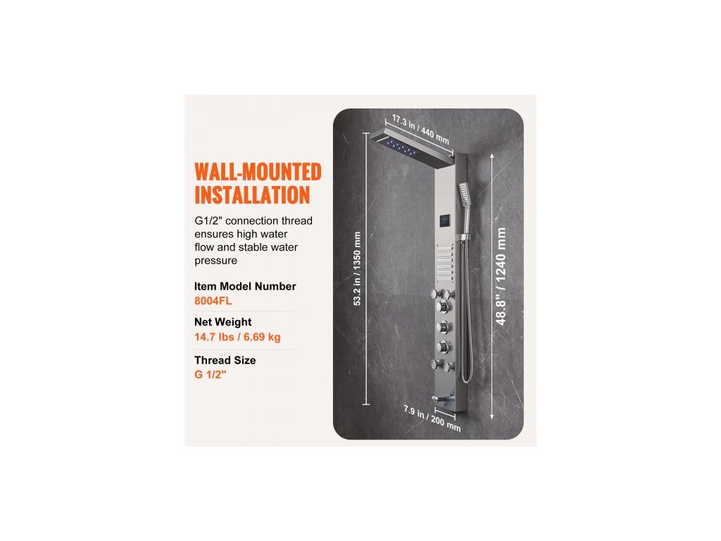 Funkce: déšť, vodopád, 5 masážních trysek, výtok z vany, ruční sprcha, Obrazovka: Ano, Číslo modelu položky: 8004FL, Režimy sprchování: 6, Sprchová hlavice s uchycením: 3 nastavení, Materiál: nerezová ocel 304, LED: Ano, Velikost závitu: G 1/2", Typ montáže: Nástěnná montáž, Rozměry výrobku: 53,2 × 7,9 × 17,3 palce/1350 × 200 × 440 mm, Čistá hmotnost: 14,7 liber/6,69 kg
