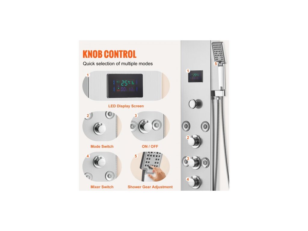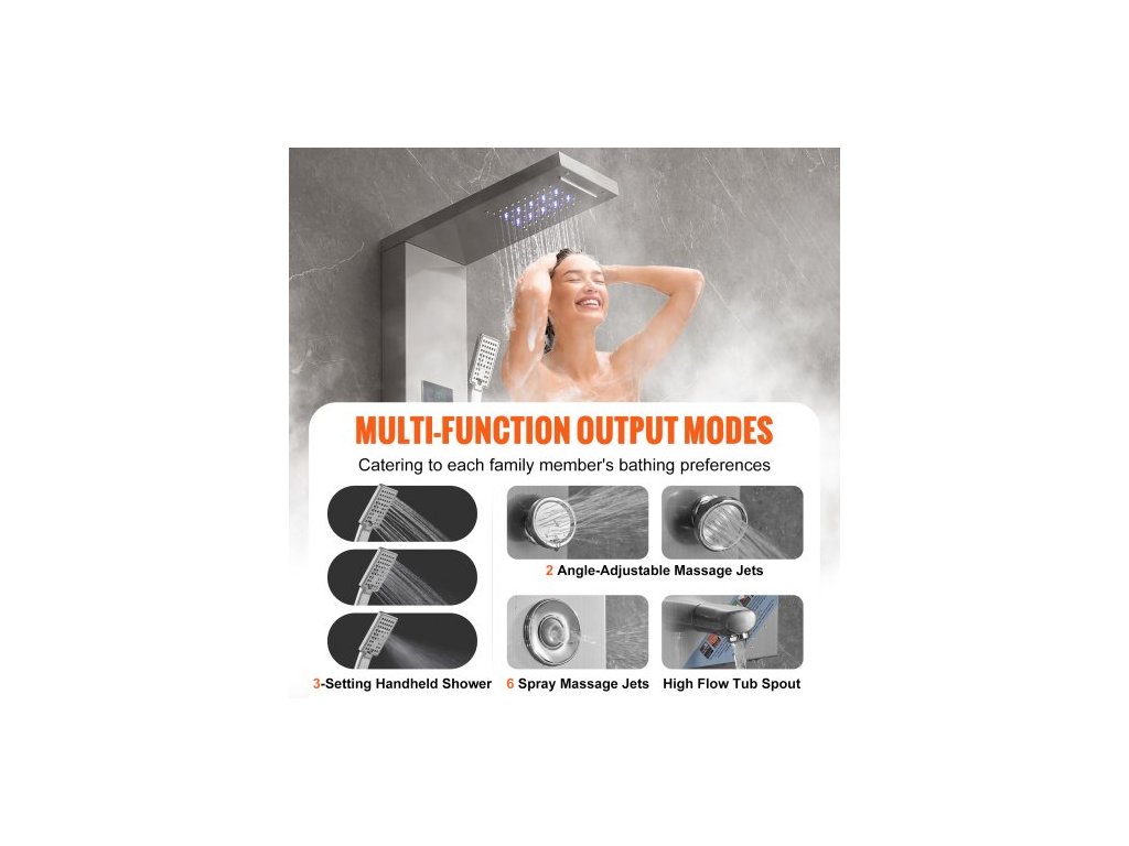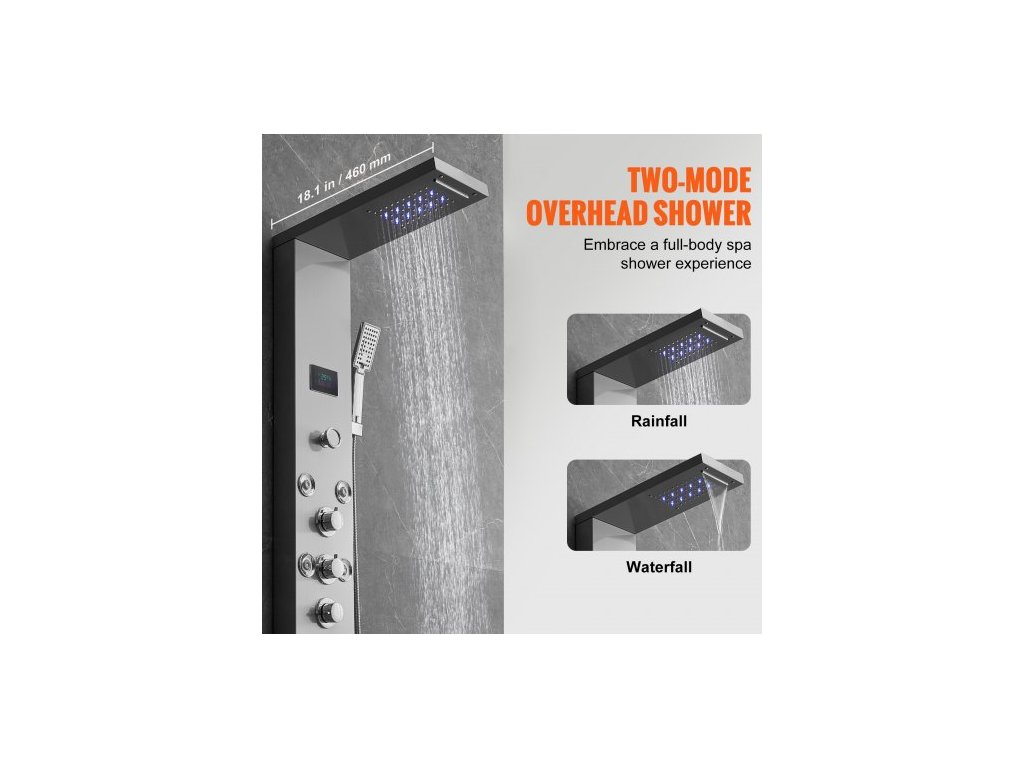 Sprchový panel , 6 sprchových režimů, LED a obrazovka, vodní sprchový panel, věž, déšť, vodopád, 8 masážních trysek, výtok z vany, ruční sprcha, nástěnná sprchová sada z nerezové oceliHorní režimy proudu