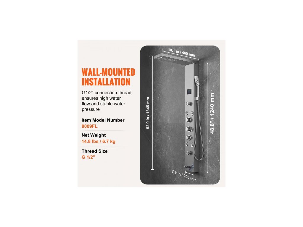 Funkce: déšť, vodopád, 8 masážních trysek, výtok z vany, ruční sprcha, Obrazovka: Ano, Číslo modelu položky: 8009FL, Režimy sprchování: 6, Sprchová hlavice s uchycením: 3stupňová, Materiál: nerezová ocel 304, LED: Ano, Velikost závitu: G 1/2", Typ montáže: Nástěnná montáž, Rozměry výrobku: 52,9 × 7,9 × 18,1 palce/1345 × 200 × 460 mm, Čistá hmotnost: 14,8 liber/6,7 kg