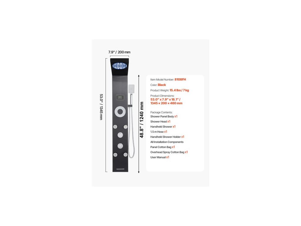 Sprchový panel s věžovým systémem a dešťovou sprchovou hlavicí, LED, sprchový sloup z kartáčované nerezové oceli 53 palců, 6funkční baterie, nástěnný masážní systém s dešťovou sprchou a 5 tryskami, ruční ovládání, výtok do vanyMěděné konektory