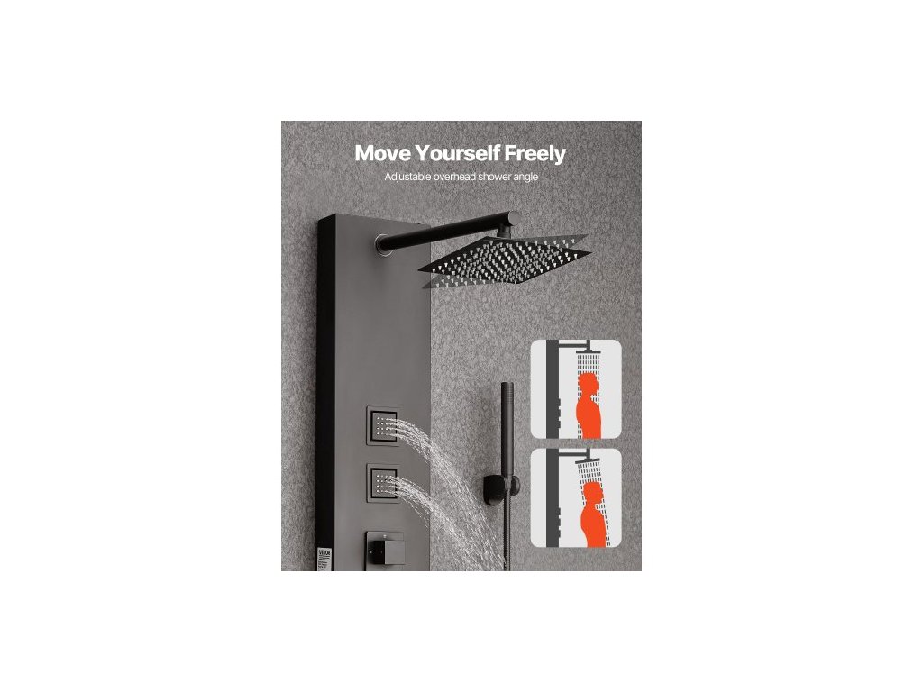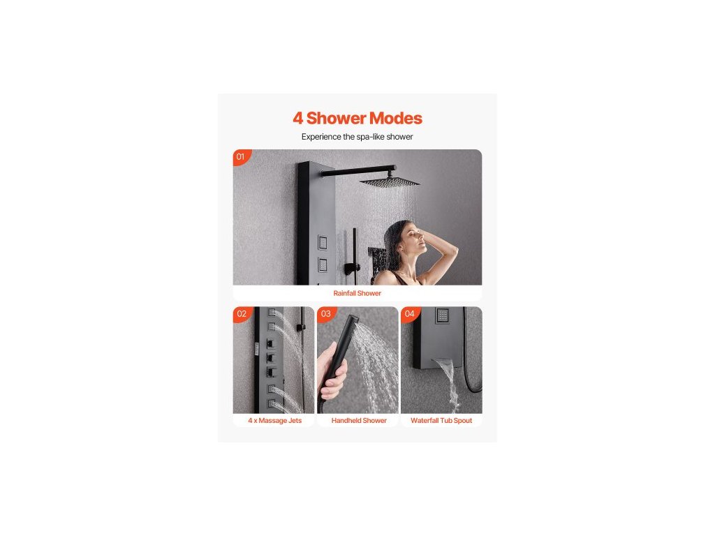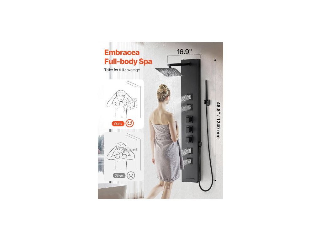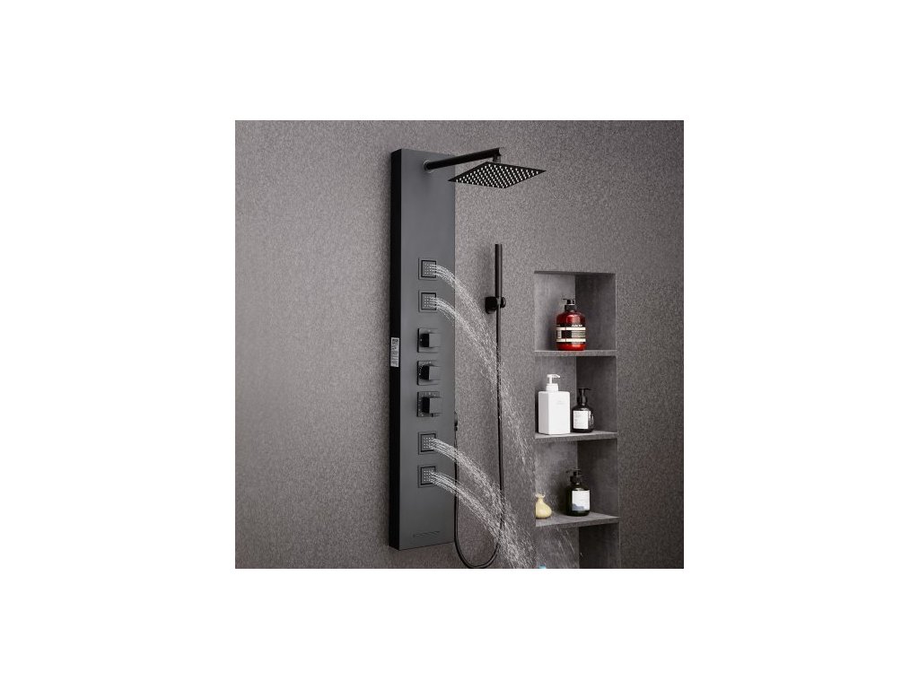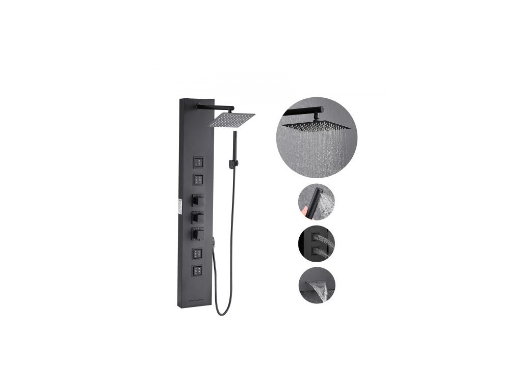 Sprchový panel s věžovým systémem a dešťovou sprchovou hlavicí, sprchovým sloupem z kartáčované nerezové oceli o průměru 122 cm, 4funkční baterií, nástěnným masážním systémem s dešťovou sprchou, 4 tryskami, ručním ovládáním a vanovým výtokem