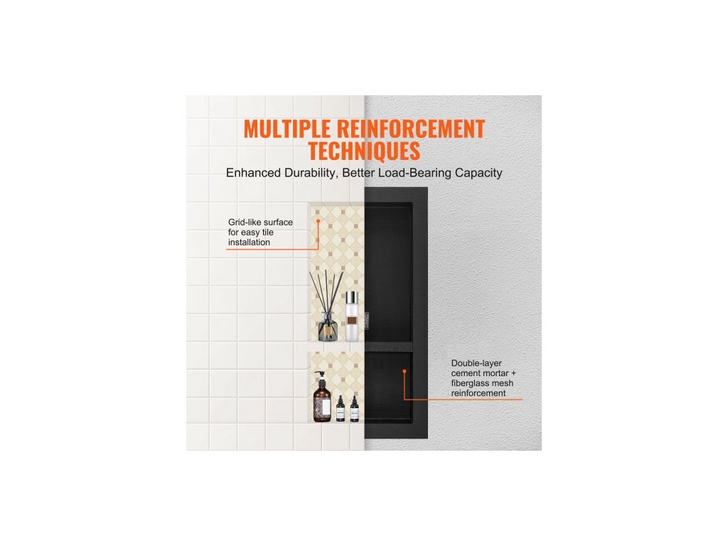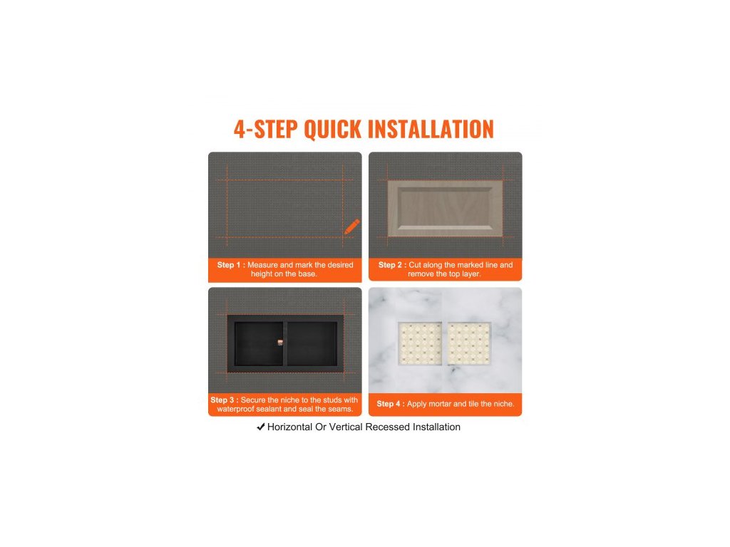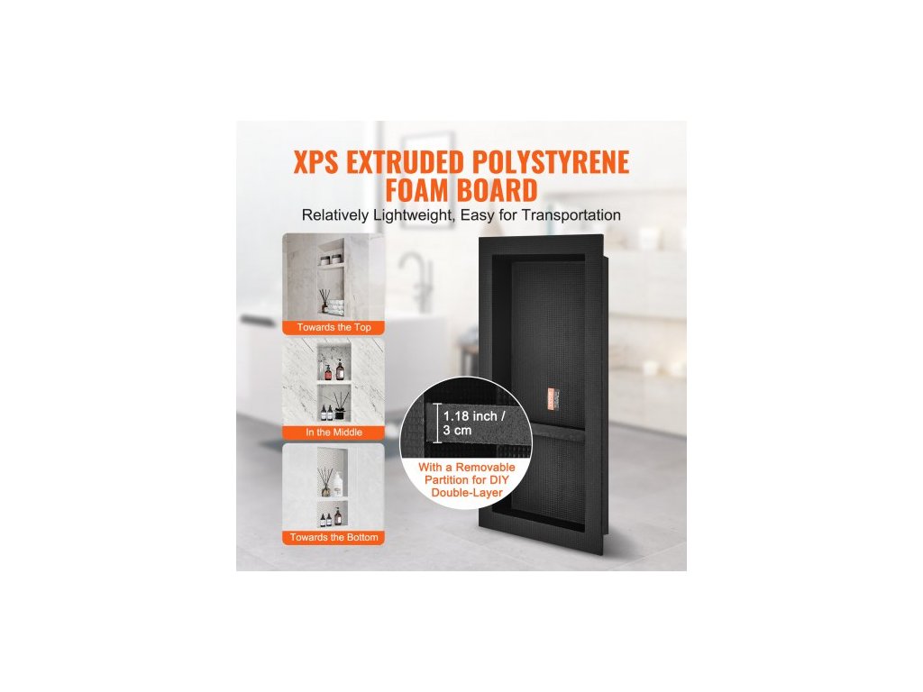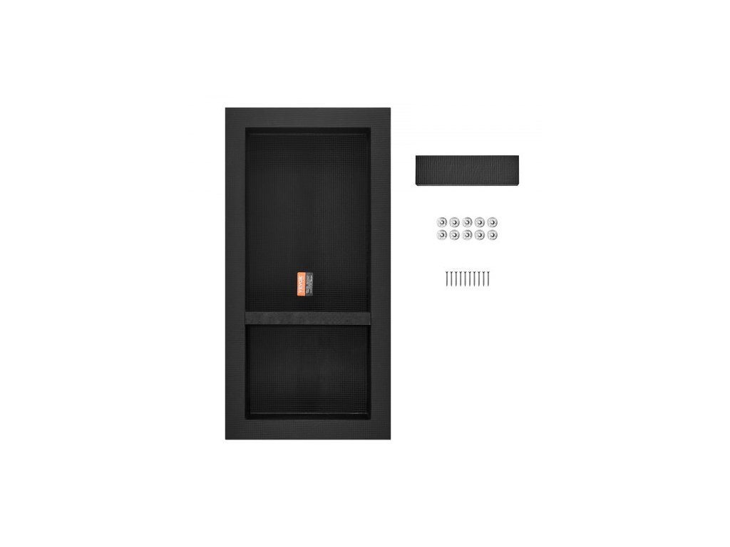 Sprchový výklenek připravený pro obklady 40,64 x 81,28 cm, Organizér s dvojitou policí, Hranaté rohy, Zapuštěný výklenek do zdi, Utěsněná ochrana, Moderní úložný prostor na mýdlo do sprchy, ČernáVoděodolný výklenek