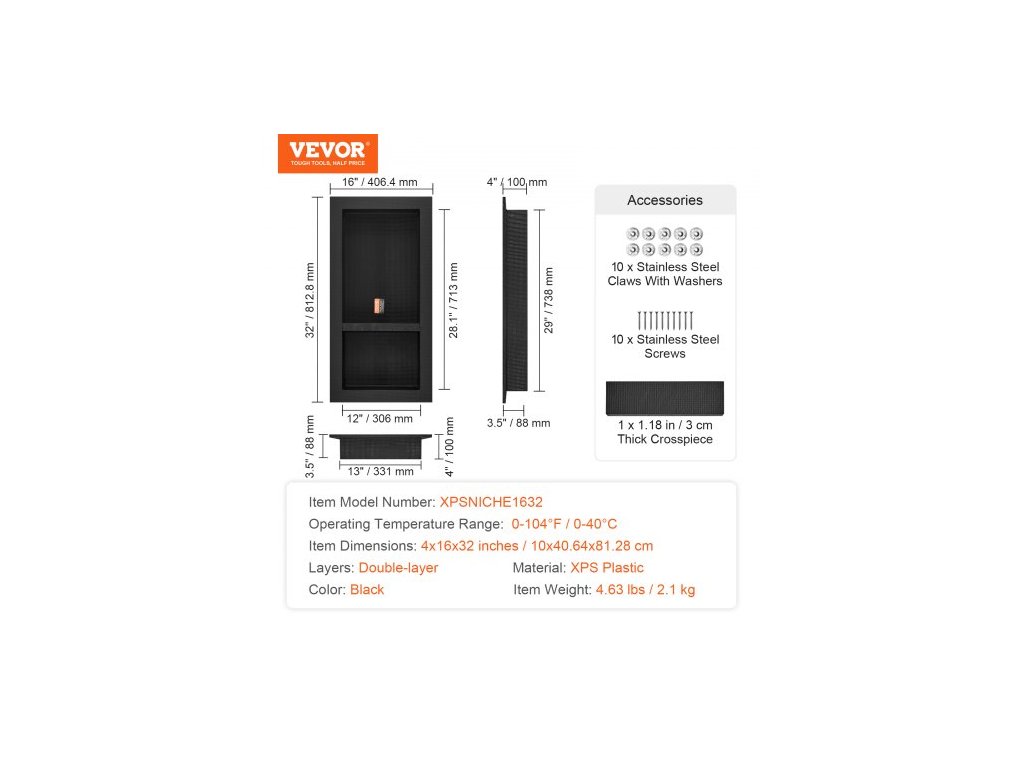 Provozní teplotní rozsah: 0–104 °F / 0–40 °C,Barva: Černá,Číslo modelu položky: XPSNICHE1632,Rozměry položky: 4x16x32 palců / 10x40,64x81,28 cm,Materiál: Plast XPS,Vrstvy: Dvouvrstvé,Hmotnost položky: 4,63 lbs / 2,1 kg