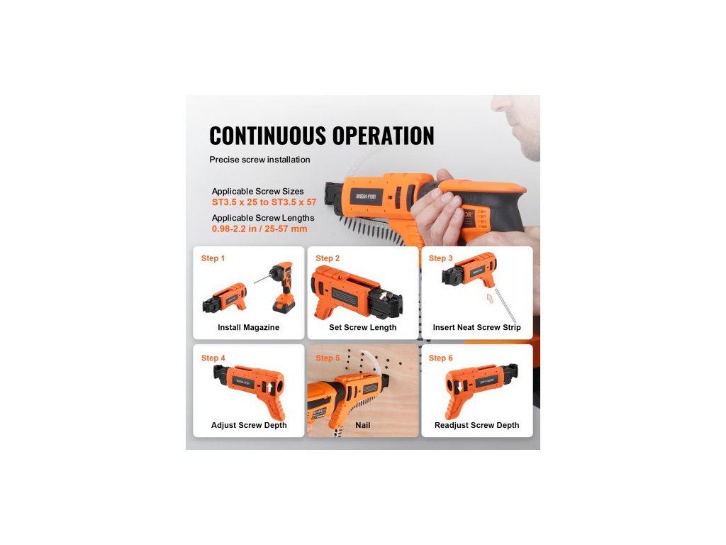Použitelná délka šroubu: 0,98-2,2 palce / 25-57 mm, Rychlost: 4200 ot./min,Použitelné velikosti šroubů: ST3,5 x 25 až ST3,5 x 57,Materiál bitu: S2,Číslo modelu položky: BR8504-P1901,Tvrdost bitu: 58-60 stupňů,Čistá hmotnost (včetně příslušenství): 7,17 lbs / 3,25 kg,Rozměry výrobku: 16,5 x 3,1 x 10,4 palce / 420 x 78 x 265 mm, Jmenovité napětí: DC20V