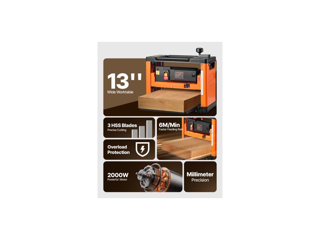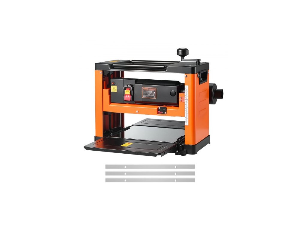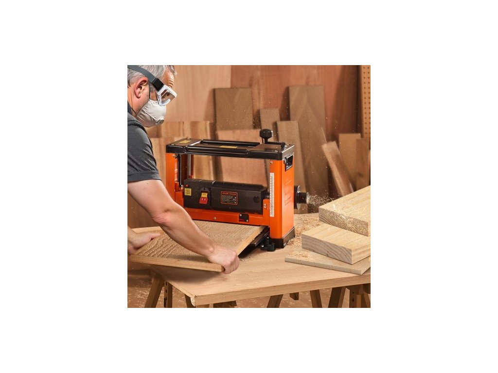 Srovnávač tloušťky , tříčepelový, pracovní stůl o šířce 330 mm, stolní elektrický srovnávač, výkonný motor 2000 W, 23 500 ot./min, dvojité válce, ochrana proti přetížení, jednorychlostní opracování dřeva, pro tvrdé a měkké dřevoKlika