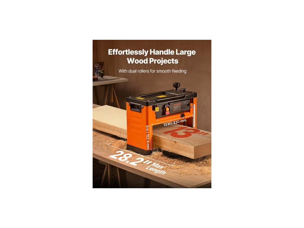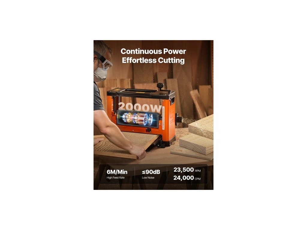 Srovnávačka tloušťky , tříčepelová, pracovní stůl se šířkou 330 mm, výkonný motor 2000 W, 23 500 ot./min, dvojité válce, ochrana proti přetížení, jednorychlostní opracování dřeva, pro tvrdé a měkké dřevěné materiály