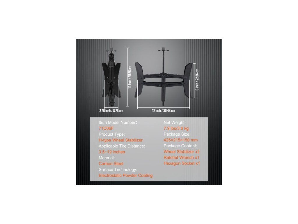 Použitelná vzdálenost pneumatik: 3,5-12 palců/8,9-30,5 cm,Typ produktu: Stabilizátor kol ve tvaru H,Povrchová technologie: Elektrostatické práškové lakování,Číslo modelu položky: 71C06F,Materiál: Uhlíková ocel,Čistá hmotnost: 7,9 lbs/3,6 kg,Rozměry balení: 16,7" x 8,5" x 5,9"/425 x 215 x 150 mm