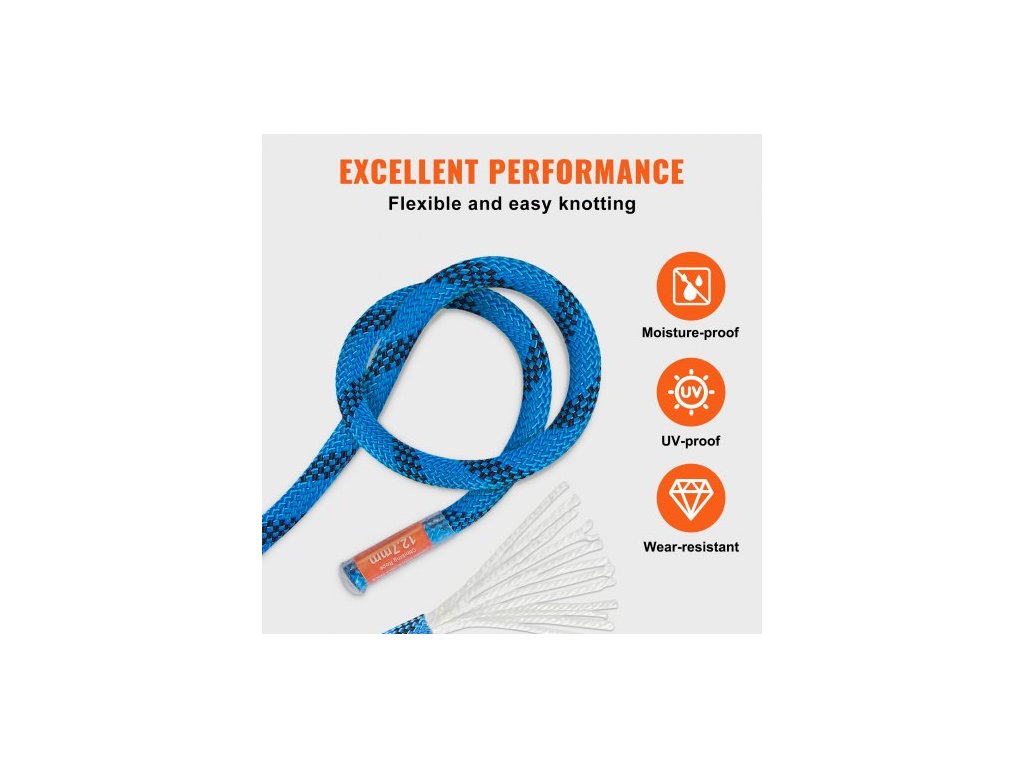 Statické lezecké lano 12,7 mm, 45,7 m (150 stop), venkovní lezecké lano, pevnost v tahu 30 kN, vláknité lano s ocelovými karabinami pro únik, slaňování a hasičskou záchranu, modréPrémiové polyesterové lano