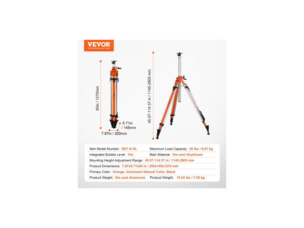 Základní barva: oranžová, přírodní hliník, černá,Číslo modelu položky: BST-K-XL,Maximální nosnost: 20 lbs / 9,07 kg,Hmotnost výrobku: 15,54 lbs / 7,05 kg,Rozměry výrobku: 7,87x5,71x50 palců / 200x145x1270 mm,Rozsah nastavení montážní výšky: 45,07-114,37 palců / 1145-2905 mm,Hlavní materiál: tlakově litý Hliníková, integrovaná bublinová vodováha: Ano