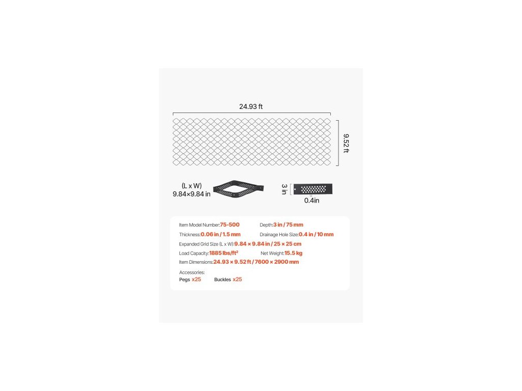 Tloušťka: 1,5 mm, Nosnost: 1885 liber/čtvereční stopu, Rozměry rozšířené mřížky (D x Š): 25 x 25 cm, Číslo modelu položky: 75-500, Rozměry položky: 24,93 x 9,52 stop / 7600 x 2900 mm, Velikost drenážního otvoru: 10 mm, Čistá hmotnost: 15,5 kg, Hloubka: 75 mm