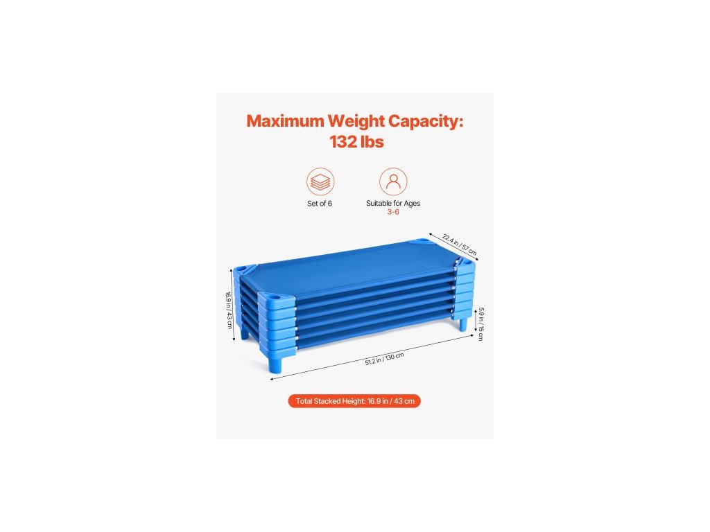 Rozměry látky: 51,2 x 22,4 palce / 130 x 57 cm, Nosnost: 132 lbs / 59,9 kg, Maximální stohovatelnost: 20 lůžek, Barva: Modrá, Číslo modelu položky: QL130-6, Sada obsahuje: 6 lůžek, Materiál: PP, pozinkovaná železná trubka, oxfordská tkanina, Čistá hmotnost sady: 37,1 lbs / 16,82 kg, Rozměry jednolůžkové postele: 51,2 x 22,4 x 5,9 palce / 130 x 57 x 15 cm