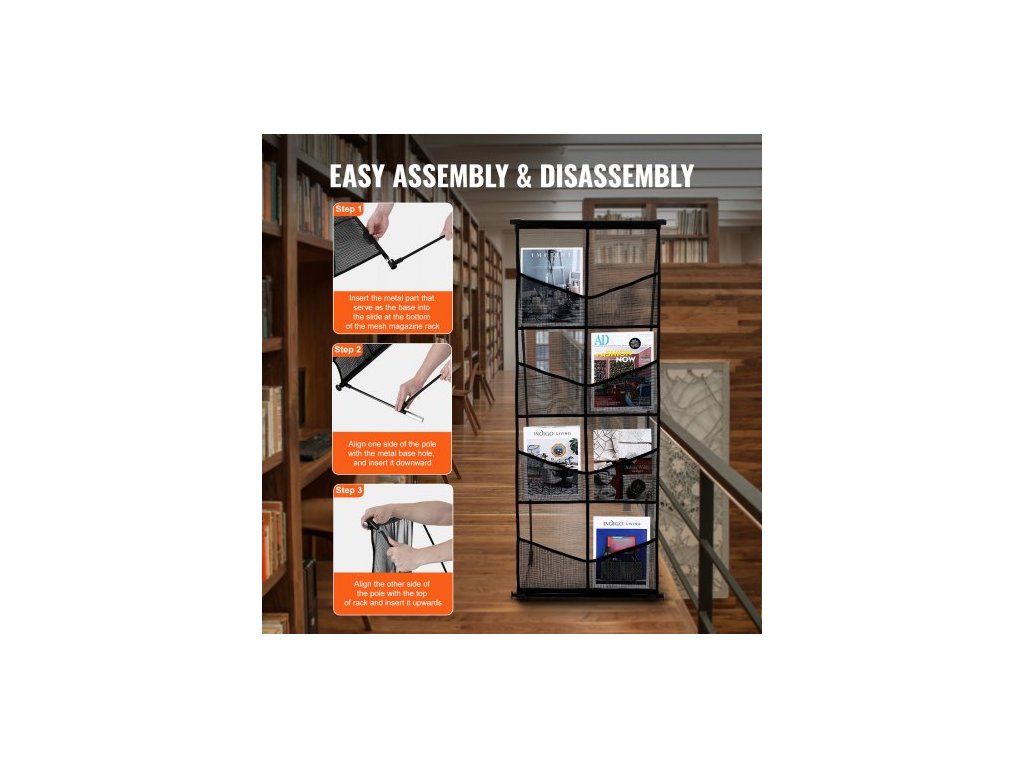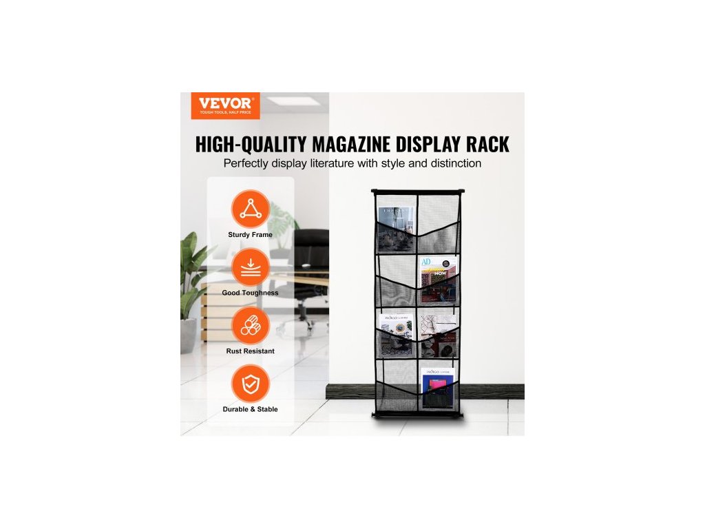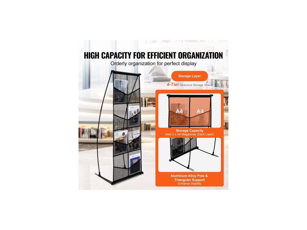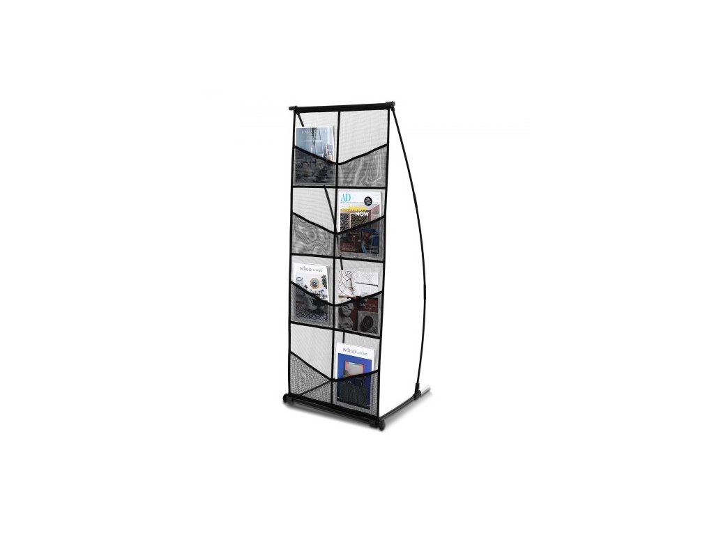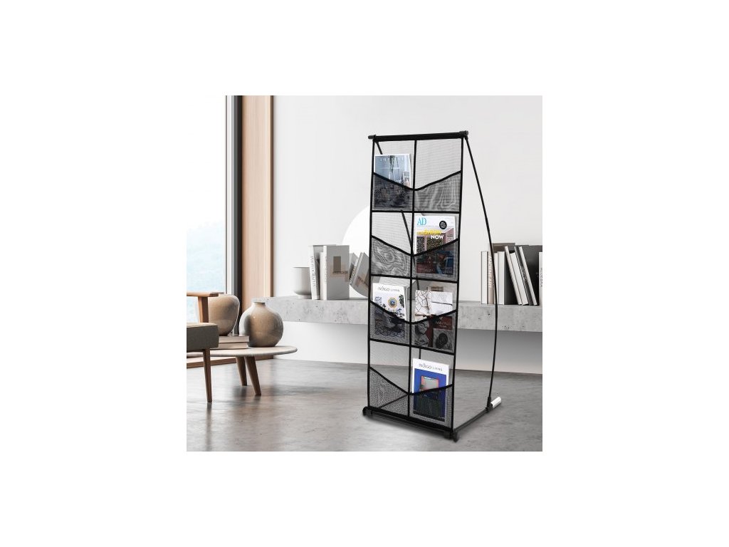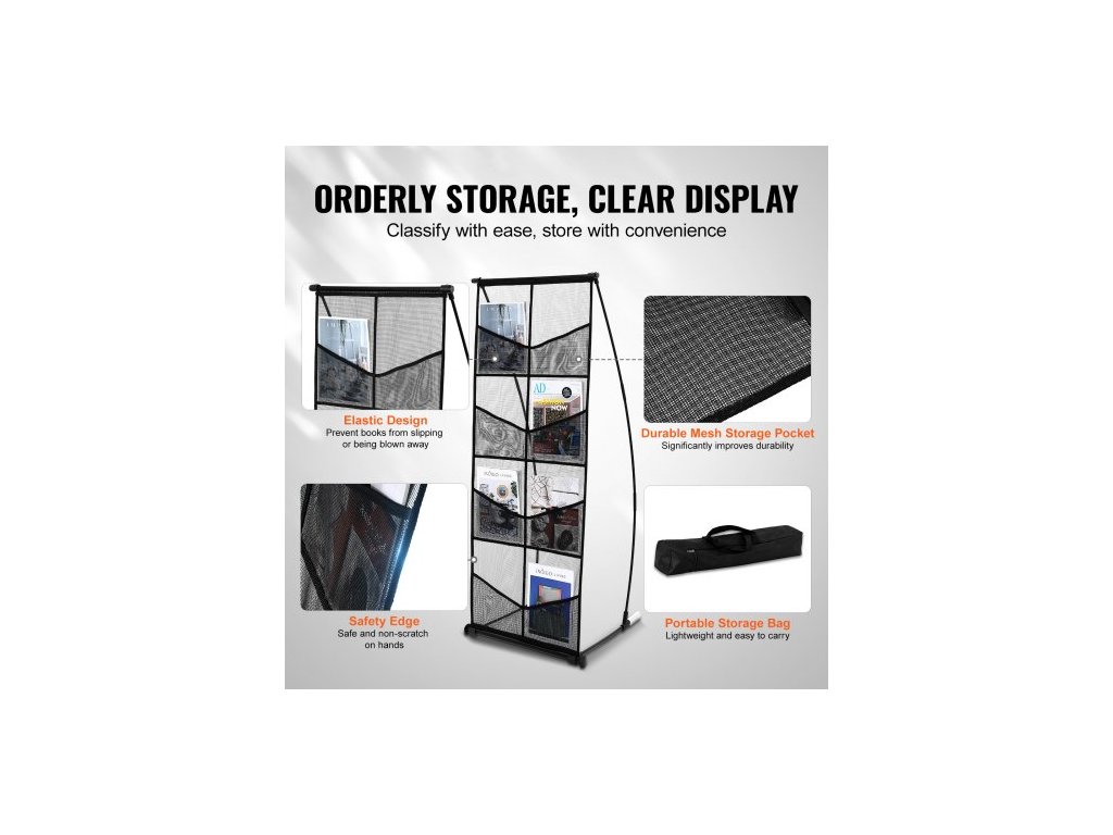 Stojan na brožury , 4patrový síťovaný držák na literaturu s 8 kapsami, stojan na časopisy, noviny a katalogy, lehký a přenosný s přepravní taškou pro obchod, výstavy a kancelářVelkokapacitní úložný prostor