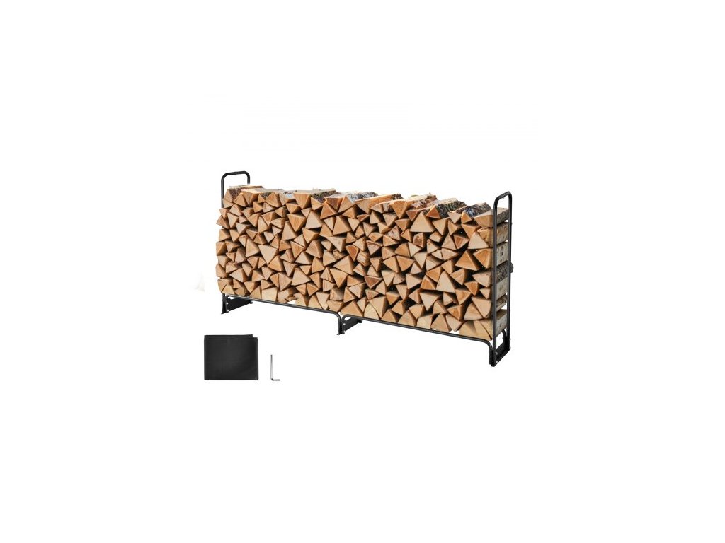 Stojan na palivové dřevo s vodotěsným krytem, venkovní držák na dřevo 2,57 m, kovový držák na polena s 1/2 šňůrou, maximální nosnost 299 kg, krytý nahoře, práškově lakovaný stojan na dřevo pro krbovou terasuZakřivená ocelová trubka