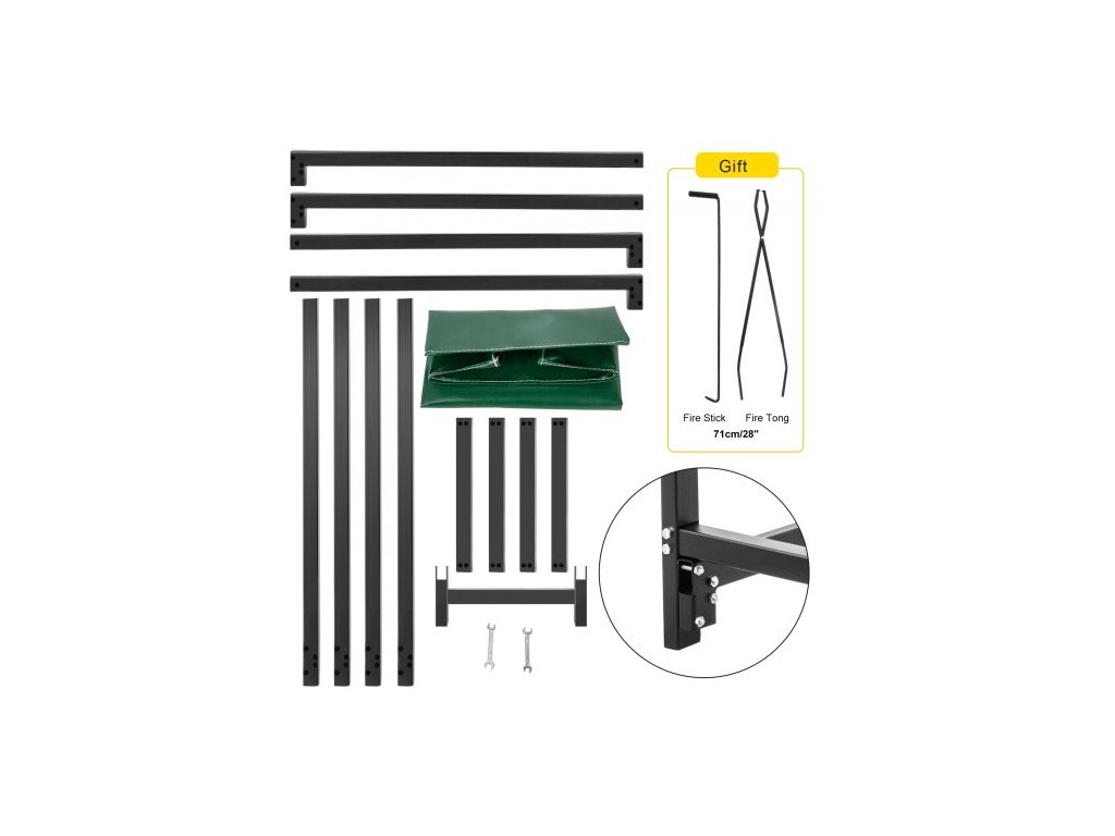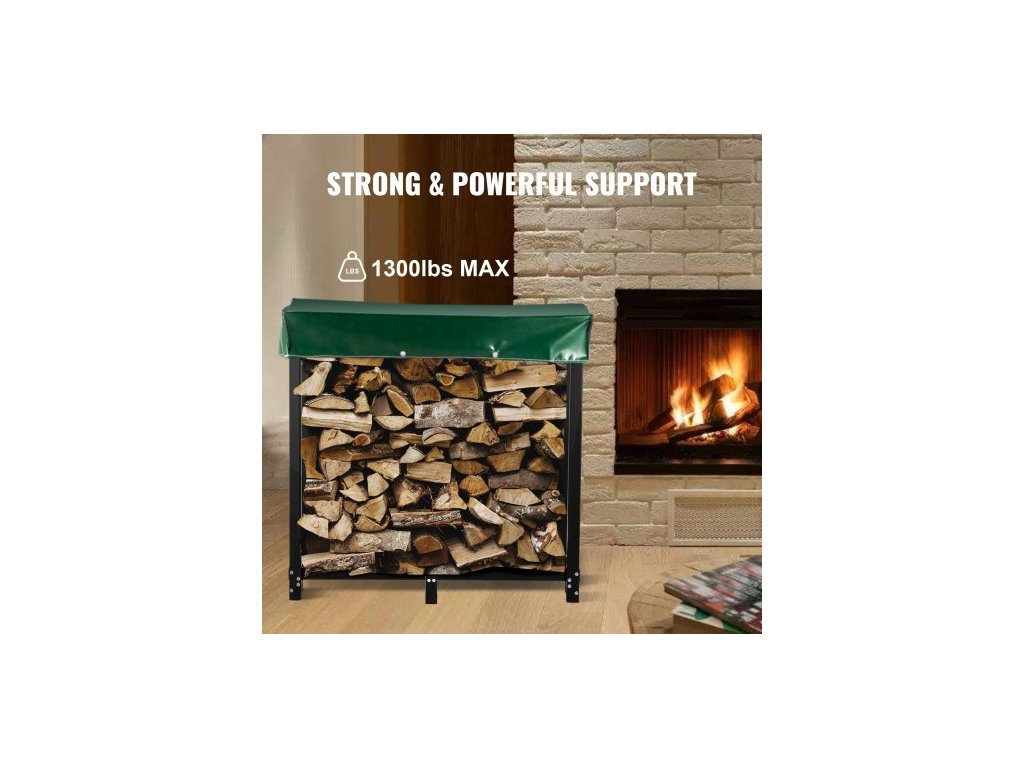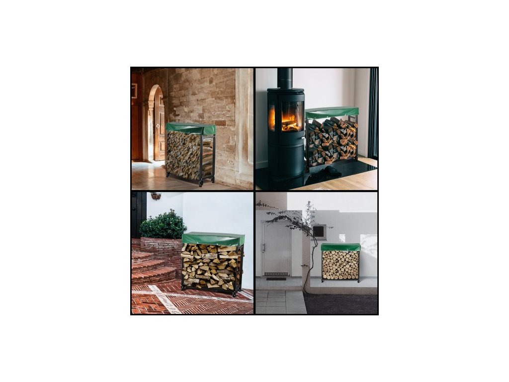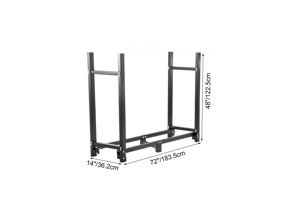 Materiál stojanů na dřevo: Trubková čtvercová ocel, barva: černá, tloušťka ocelové trubky: 2 mm / 0,08", rozměry nosných trubek (DxŠ): 40x40 mm / 1,6"x1,6", výška vyšších nožiček: 18,3 cm / 7,2", povrch: černý lak, rozměry hlavních trubek (DxŠ): 30x50 mm / 1,2"x2", výška spodních nožiček: 8 cm / 3", nosnost: 590 kg/ 1300 lbs, Materiál krytu: PVC, Rozměry krytu (DxŠxV): 183,5x36,2x27,5 cm / 72"x14"x10,8", Velikost pohrabáče a kleští: 71 mm / 2,8", Rozměry stojanu na polena (DxŠxV): 183,5x36,2x122 cm / 72"x14"x48", Hmotnost položky: 23 kg / 50,7 lbs