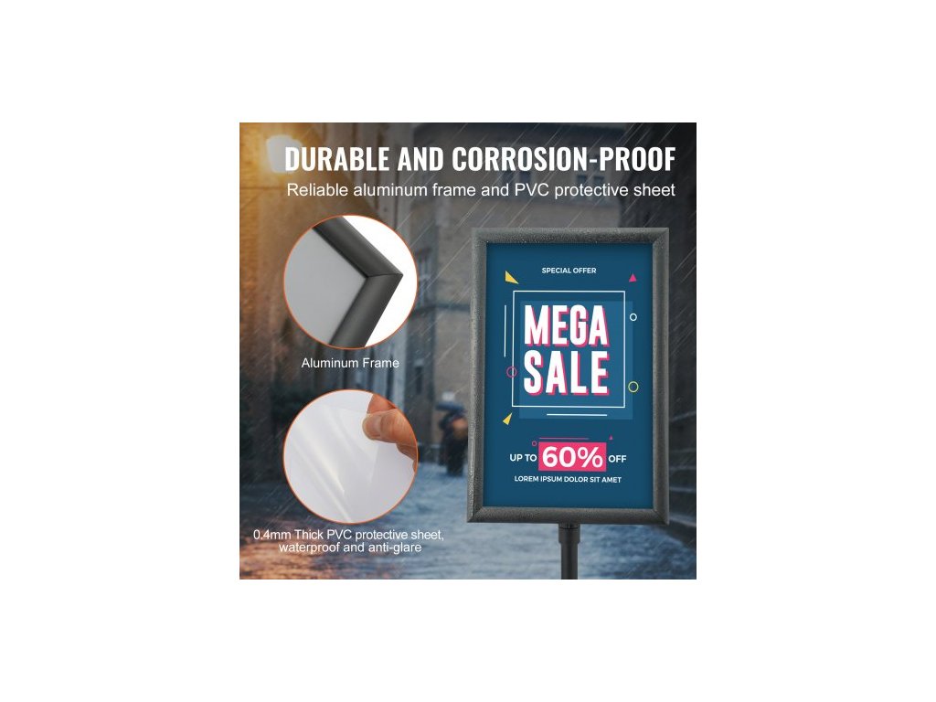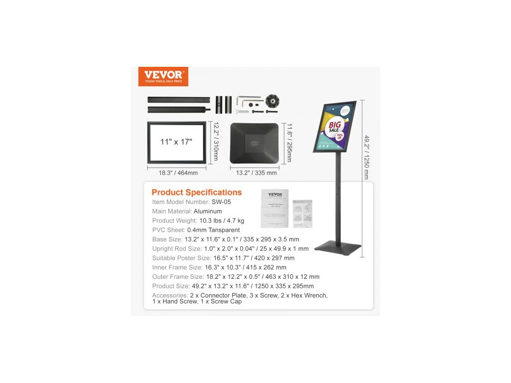 Vnější rozměr rámu: 18,2" x 12,2" x 0,5" / 463 x 310 x 12 mm,Rozměry svislé tyče: 1,0" x 2,0" x 0,04" / 25 x 49,9 x 1 mm,Vhodná velikost plakátu: 16,5" x 11,7" / 420 x 297 mm,Vnitřní rozměr rámu: 16,3" x 10,3" / 415 x 262 mm,Rozměry základny: 13,2" x 11,6" x 0,1" / 335 x 295 x 3,5 mm, Číslo modelu položky: SW-05, Hmotnost výrobku: 10,3 lbs / 4,7 kg, PVC deska: 0,4 mm průhledná, Hlavní materiál: Hliník, Rozměry výrobku: 49,2" x 13,2" x 11,6" / 1250 x 335 x 295 mm