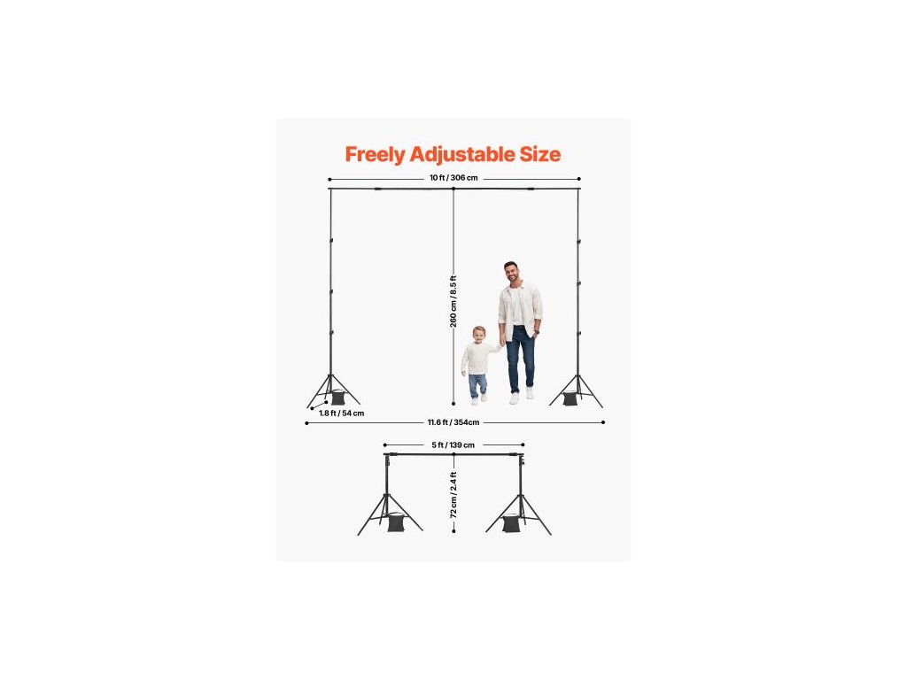 Nastavitelná výška: 2,4-8,5 stop / 72-260 cm,Barva: Černá,Číslo modelu položky: BJJ-8510,Nastavení šířky: 5-10 stop / 139-306 cm,Materiál: Uhlíková ocel Q195,Rozměry látky na pozadí: 8,5 x 10 stop / 260 x 300 cm,Rozměry výrobku: 11,6 x 1,8 x 8,5 stop / 354 x 54 x 260 cm,Čistá hmotnost: 6,1 2,77 kg