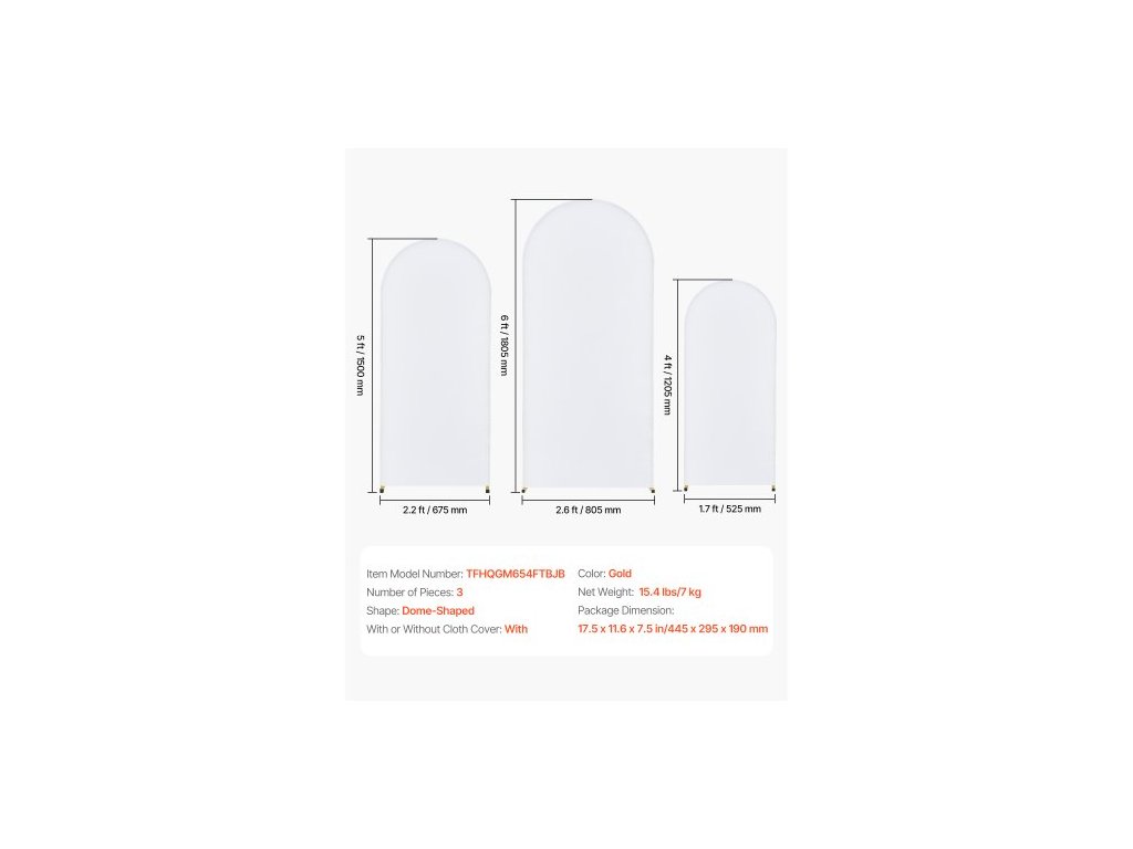 Tvar: Kupolovitý,Rozměry výrobku: 17,5 x 11,6 x 7,5 palce/445 x 295 x 190 mm,Počet dílů: 3,Oblouk 1: 6 x 2,6 stop/805 x 405 x 1805 mm,Barva: Zlatá,Číslo modelu položky: TFHQGM654FTBJB,Oblouk 2: 5 x 2,2 stopy/675 x 405 x 1500 mm,Oblouk 3: 4 x 1,7 stopy /525 x 405 x 1205 mm, Čistá hmotnost: 7 kg, S látkovým potahem nebo bez něj: S, Velikost produktu: