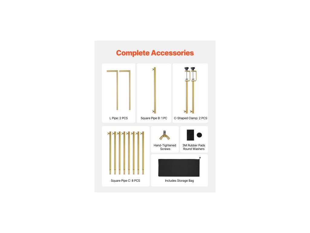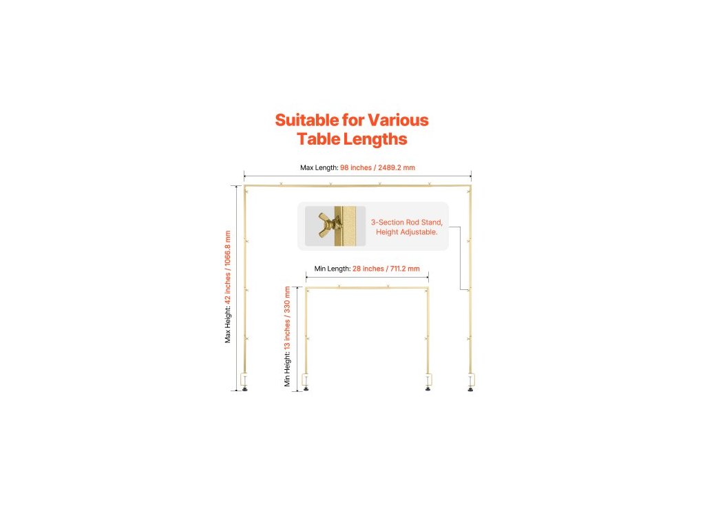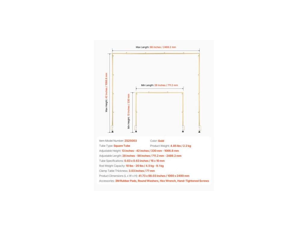 Nastavitelná výška: 330 mm - 1066,8 mm,Typ trubky: Čtvercová trubka,Specifikace trubky: 16 x 16 mm,Barva: Zlatá,Číslo modelu položky: ZS25003,Hmotnost výrobku: 2,2 kg,Nosnost tyče: 4,5 kg - 9,1 kg,Tloušťka upínacího stolu: 8,7 cm 77 mm,Rozměry produktu (D x Š x V): 41,73 x 98,03 palce / 1060 x 2490 mm,Nastavitelná délka: 28 palců - 98 palců / 711,2 mm - 2489,2 mm