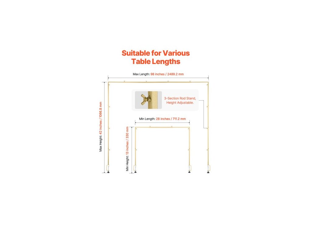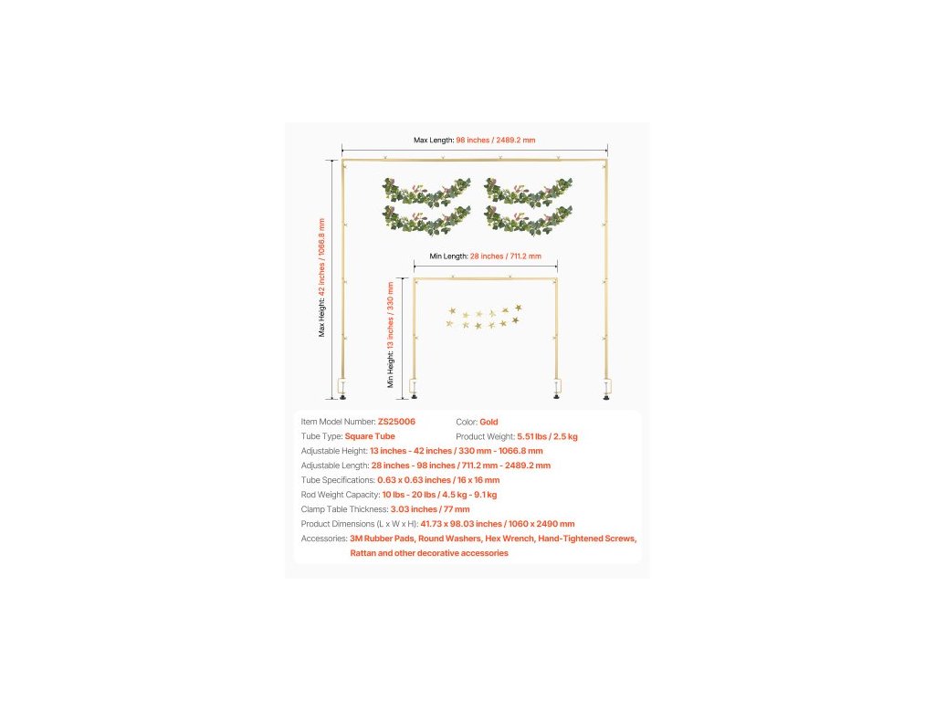 Nastavitelná výška: 330 mm - 1066,8 mm,Typ trubky: Čtvercová trubka,Specifikace trubky: 16 x 16 mm,Barva: Zlatá,Číslo modelu položky: ZS25006,Hmotnost výrobku: 2,2 kg,Nosnost tyče: 4,5 kg - 9,1 kg,Tloušťka upínacího stolu: 3,03 palce / 77 mm,Rozměry produktu (D x Š x V): 41,73 x 98,03 palce / 1060 x 2490 mm,Nastavitelná délka: 28 palců - 98 palců / 711,2 mm - 2489,2 mm