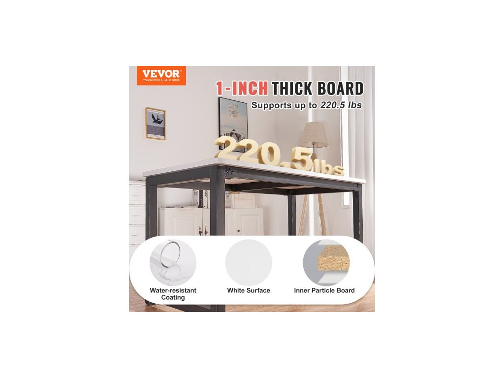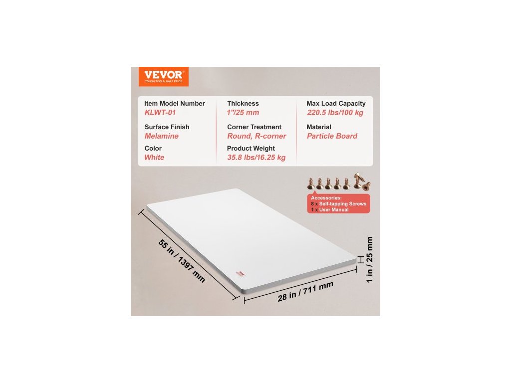 Tloušťka: 1"/25 mm,Úprava rohů: Kulatá, R-roh,Barva: Bílá,Číslo modelu položky: KLWT-01,Hmotnost výrobku: 35,8 lbs/16,25 kg,Maximální nosnost: 220,5 lbs/100 kg,Povrchová úprava: Melamin,Materiál: Dřevotřísková deska,Rozměry výrobku: 55" x 28"/1397 x 711 mm