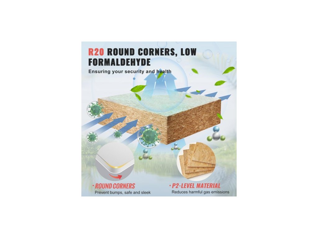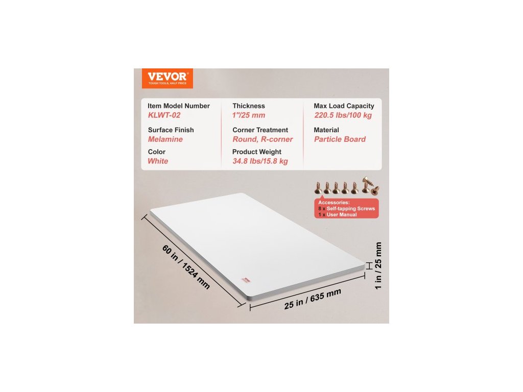 Tloušťka: 1"/25 mm,Úprava rohů: Kulatá, R-roh,Barva: Bílá,Číslo modelu položky: KLWT-02,Hmotnost výrobku: 34,8 lbs/15,8 kg,Maximální nosnost: 220,5 lbs/100 kg,Povrchová úprava: Melamin,Materiál: Dřevotřísková deska,Rozměry výrobku: 60" x 25"/1524 x 635 mm