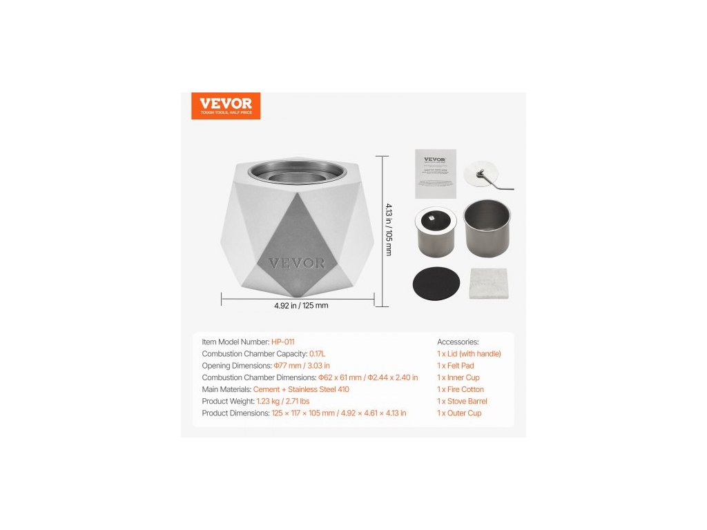 Hlavní materiály: Cement + nerezová ocel 410,Rozměry otvoru: Φ77 mm / 3,03 palce,Číslo modelu položky: HP-011,Hmotnost výrobku: 1,23 kg / 2,71 lbs,Rozměry výrobku: 125 x 117 x 105 mm / 4,92 x 4,61 x 4,13 palce,Objem spalovací komory: 0,17 l,Rozměry spalovací komory: Φ62 x 61 mm / Φ2,44 x 2,40 palce