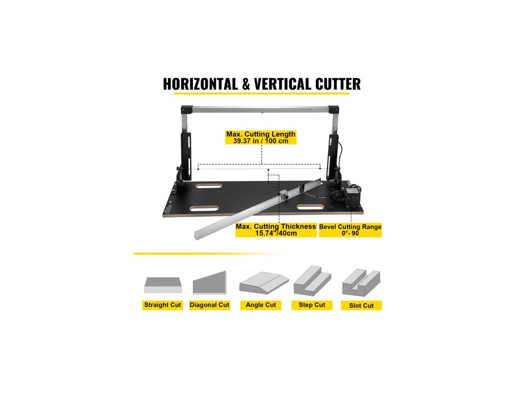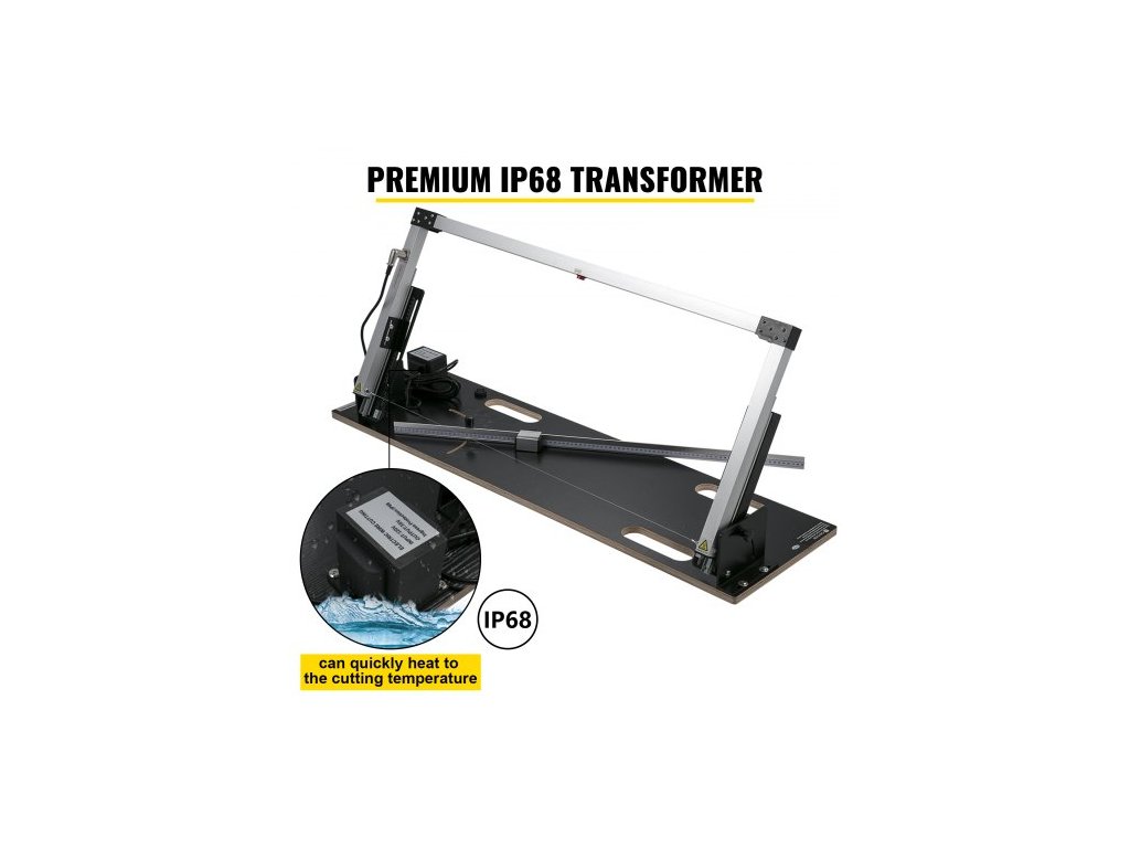 Průměr topného drátu: 0,02" / 0,5 mm,Rozsah zkoseného řezu: 0 - 90°,Rozměry položky: 54,33" x 13,78" x 5,91" / 138 x 35 x 15 cm,Materiál topného drátu: Gr20Ni80,Provozní teplota: 360℃ / 680℉,Materiál rámu: Hliníková slitina,Vstupní napětí: 220V,Maximální délka řezu: 39,37'' / 100 cm,Výstupní napětí: 38 V, Výkon: 200 W, Maximální tloušťka řezu: 42 cm (doporučeno 40 cm), Stupeň vodotěsnosti transformátoru: IP 68