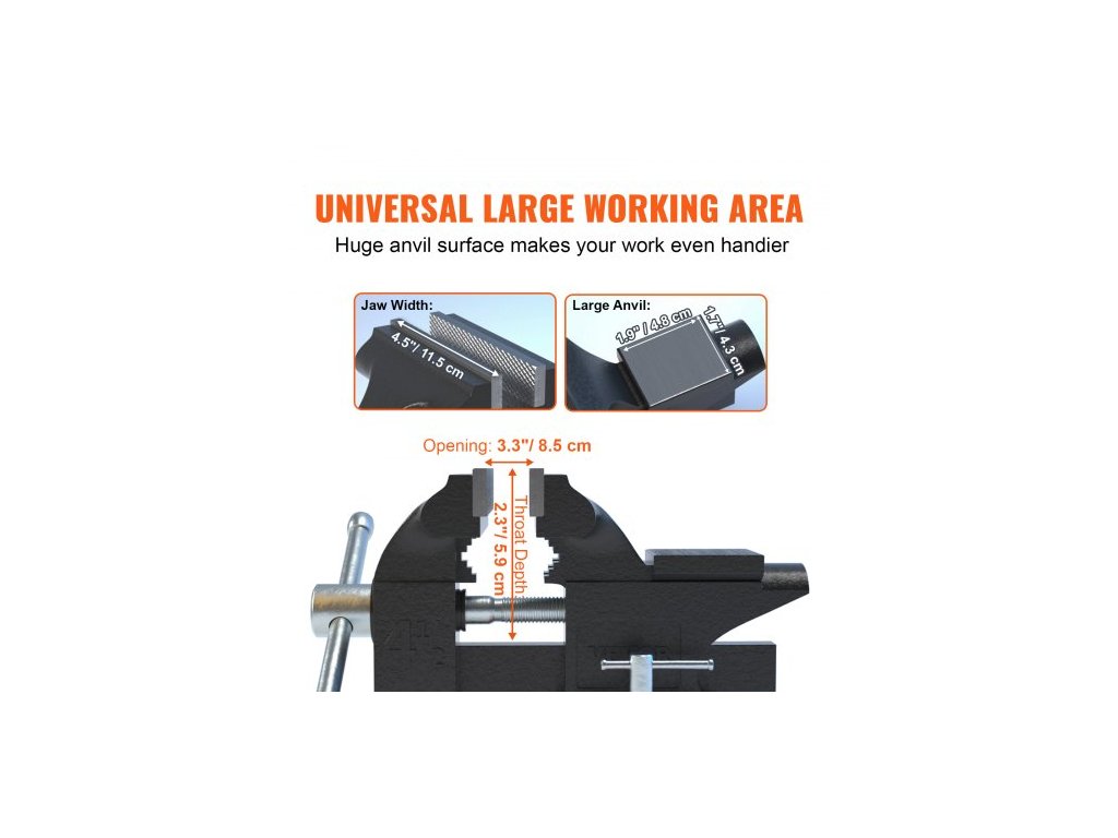 Stolní svěrák , šířka čelistí 114 mm (4,5 palce), rozevření čelistí 84 mm (3,3 palce), otočná a zajišťovací základna 240 stupňů, víceúčelový svěrák s kovadlinou, vysoce odolný litinový pracovní svěrák se šrouby a maticemi, pro vrtání, řezání trubek, flexibilní otáčení 240°, průmyslová litina, vynikající síla záběru, velká a odolná kovadlina, zaručená stabilita, přesný závitový šroub Acme, otočná základna: 240 stupňů, šířka čelistí: 4,5" / 11,5 cm, rozměry výrobku (D x Š x V): 9,5" x 4,6" x 5,7" / 24 x 11,7 x 14,6 cm, hloubka vyložení: 2,3" / 5,9 cm, model: 4,5 Bench Rozměry svěráku, kovadliny (D x Š): 4,8 x 4,3 cm, Průměr upínání trubek: 1,5–4,5 cm, Rozevření čelistí: 8,5 cm, Materiál: Litina, Čistá hmotnost: 4,6 kg, Certifikace: CEDoplňkové parametry
