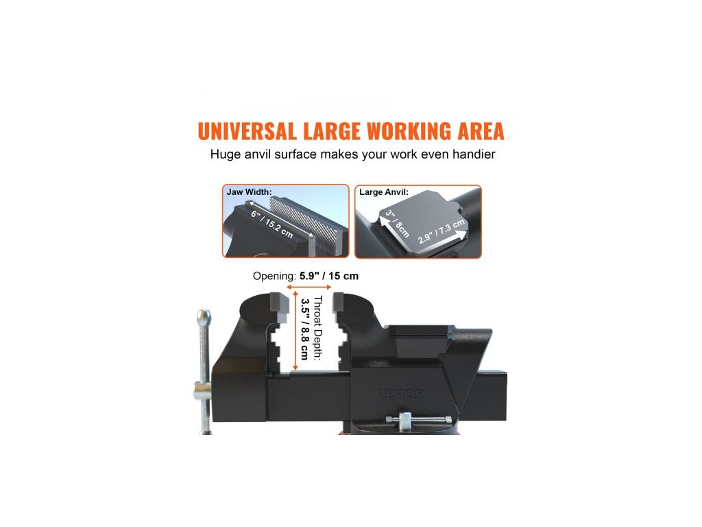 Otočná základna: 360 stupňů, Šířka čelisti: 6" / 15,2 cm, Rozměry položky (D x Š x V): 14,4" x 6" x 7,4" / 36,5 x 15,1 x 18,9 cm, Hloubka hrdla: 3,5" / 8,8 cm, Model: 6 stolních svěráků, Velikost kovadliny (D x Š): 2,9" x 3" / 7,3 x 8 cm,Průměr upínání trubky: ø0,6"-2,9" / ø1,5-7,4 cm,Rozteč čelistí: 5,9" / 15 cm,Materiál: Tvárná litina,Čistá hmotnost: 25 lbs / 11,3 kg,Certifikace: CE