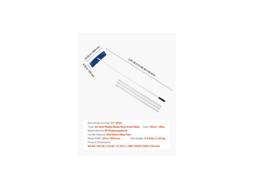Materiál nože: PP (polypropylen),Typ: Střešní hrabáče na sníh s plastovou noží 24 palců,Barva: Stříbrná + modrá,Číslo modelu položky: CY-SF22,Rozměry produktu: 46,46–218,50 x 23,62 x 6,10 palců/1180–5550 x 600 x 155 mm, Čistá hmotnost: 5,40 lbs/2,45 kg, Materiál rukojeti: Hliníková slitina, Tyč, Šířka čepele: 24 palců/600 mm