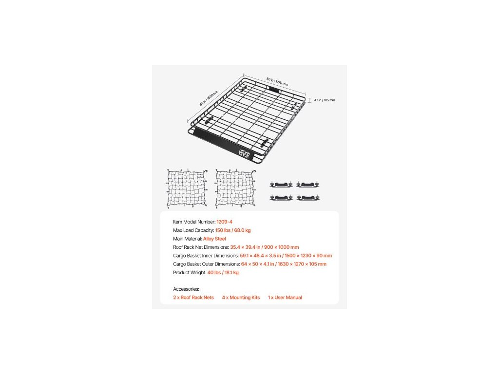 Vnitřní rozměry koše: 59,1 x 37,4 x 3,5 palce / 1500 x 950 x 90 mm, Vnější rozměry koše: 64 x 50 x 4,1 palce / 1630 x 1270 x 105 mm, Číslo modelu položky: 1209-4, Hmotnost výrobku: 40 liber / 18,1 kg, Maximální nosnost: 68,0 kg, Čisté rozměry střešního nosiče: 900 x 1000 mm, Hlavní materiál: Legovaná ocel