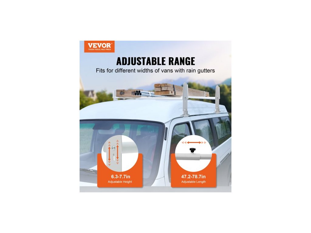 Střešní nosič žebříků pro dodávky, 2 tyčové nosiče žebříků z legované oceli, nastavitelné od 1200 do 2000 mm, nosnost 227 kg, kompatibilní s dodávkami velké velikosti s okapem, Chevrolet Express, GMC SavanaNosnost 500 lb