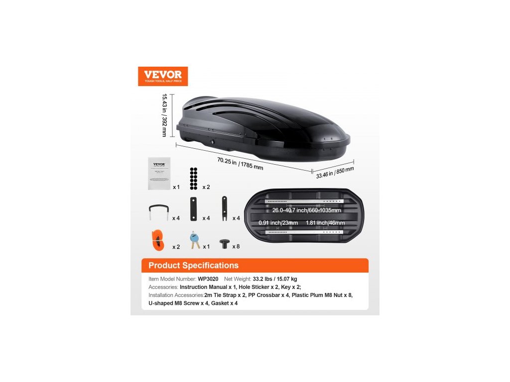 Maximální nosnost: 75 kg, Číslo modelu položky: WP3020, Úložný prostor: 340 l, Čistá hmotnost: 15,07 kg, Hlavní materiál: ABS, Rozměry výrobku: 1785 x 850 x 392 mm
