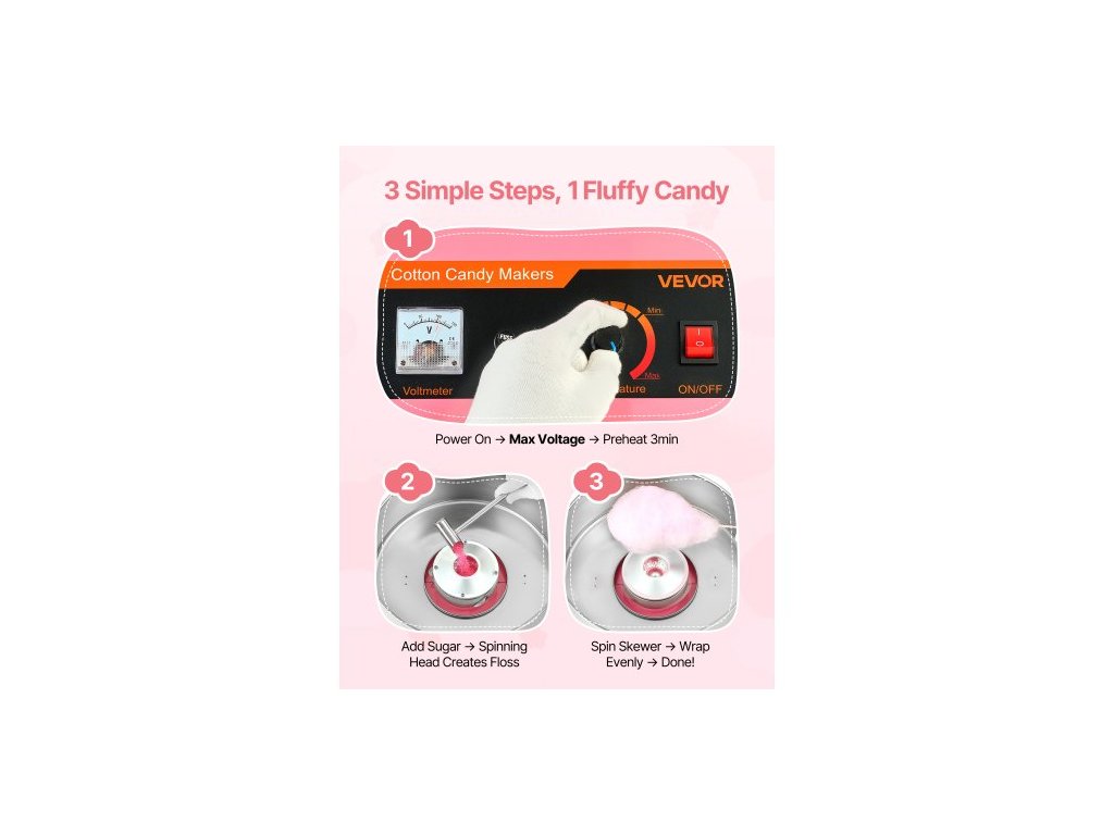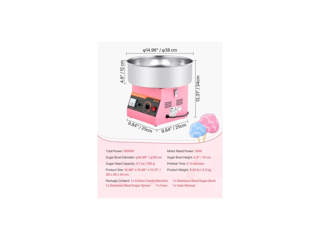 Jmenovitý výkon motoru: 30 W, Průměr cukřenky: φ14,96 palce / φ38 cm, Výška cukřenky: 4,8 palce / 12 cm, Celkový výkon: 1000 W, Číslo modelu položky: MHTJJPXMO1-3S, Doba předehřívání: 2–3 minuty, Hmotnost výrobku: 10,65 lb / 4,83 kg, Kapacita cukrové hlavice: 3,7 oz / 105 g, Maximální otáčky motoru: 3500 ot./min Rozměry: 14,96 x 14,96 x 13,31 palce / 38 x 38 x 34 cm