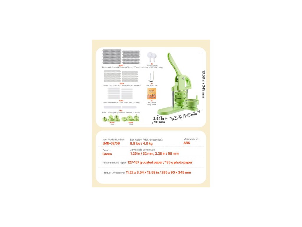 Doporučený papír: 127–157 g potahovaný papír / 135 g fotografický papír,Barva: Zelená,Číslo modelu položky: JMB-32/58,Čistá hmotnost (s příslušenstvím): 8,8 lbs / 4,0 kg,Rozměry výrobku: 11,22 x 3,54 x 13,58 palce / 285 x 90 x 345 mm,Kompatibilní velikosti knoflíků: 1,26 palce / 32 mm 2,28 palce / 58 mm, hlavní materiál: ABS
