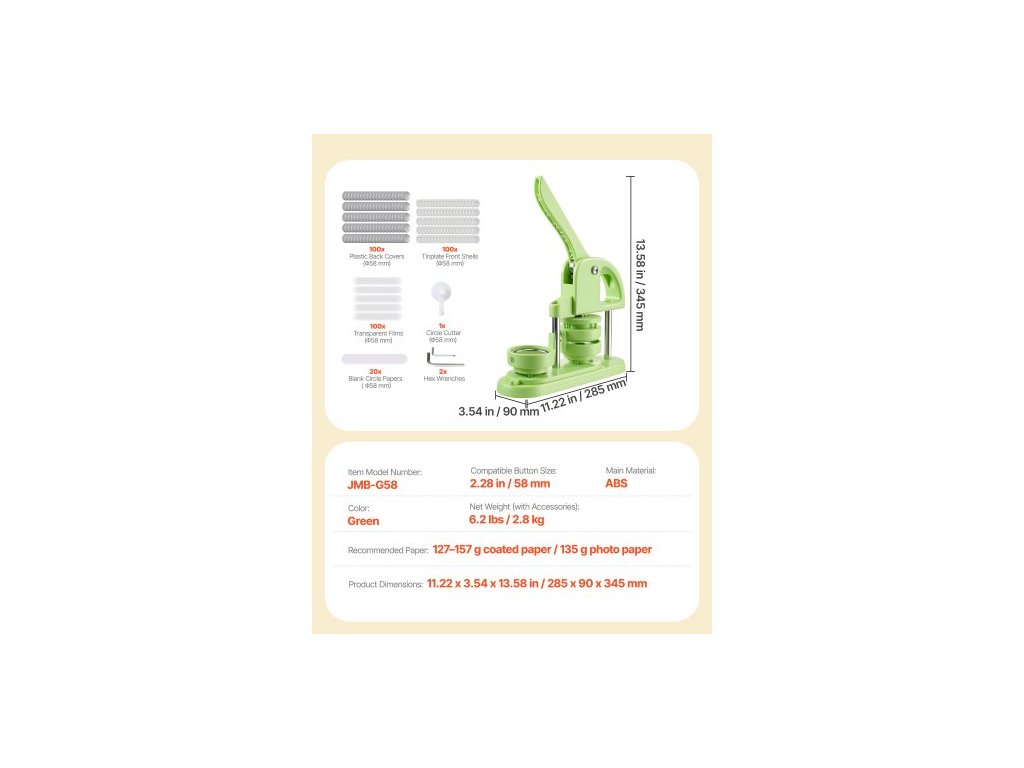 Kompatibilní velikost knoflíků: 58 mm,Doporučený papír: 127–157 g potahovaný papír / 135 g fotografický papír,Barva: Zelená,Číslo modelu položky: JMB-G58,Čistá hmotnost (s příslušenstvím): 2,8 kg,Rozměry výrobku: 285 x 90 x 345 mm,Hlavní materiál: ABS
